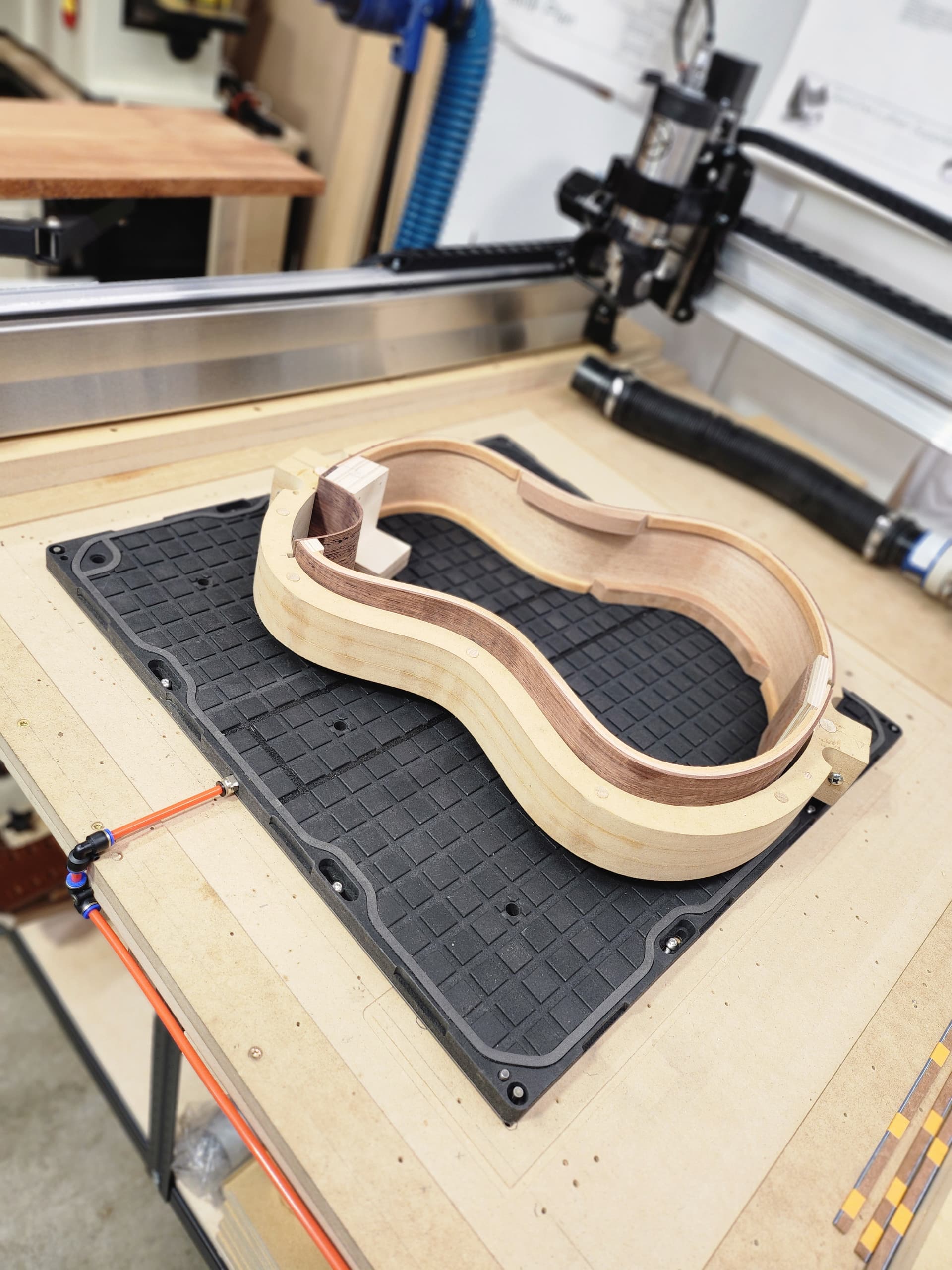 I’ve had the 24x24 Airweights table for a couple of weeks now, and I love it. It may not be for everyone, but for my workflow, it has been extremely helpful. I have just started making different fixture plates for all my acoustic guitar parts, like tops, backs, fretboards, etc. As well as my electric guitar stuff. The best part is no more tape and CA glue.