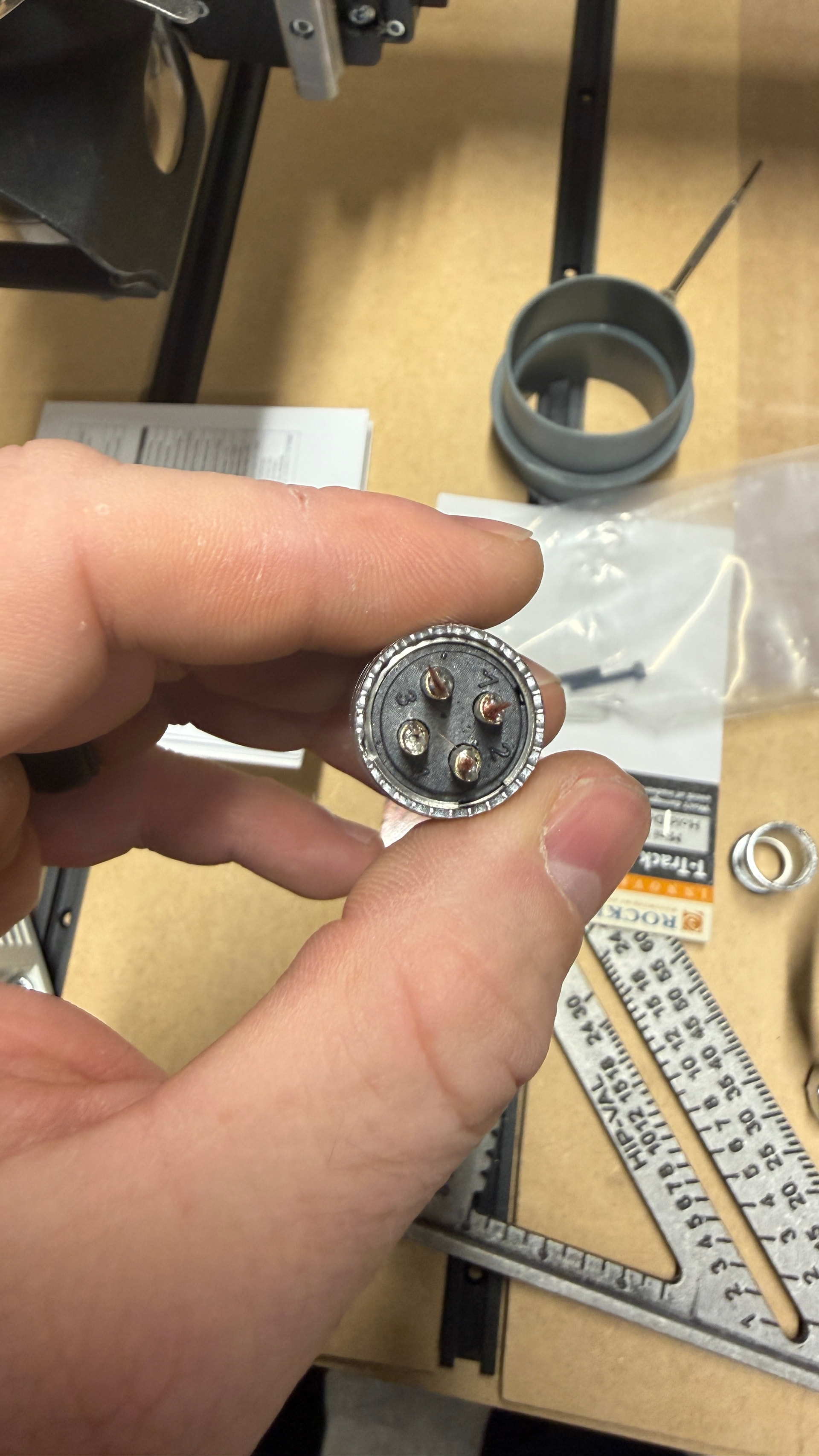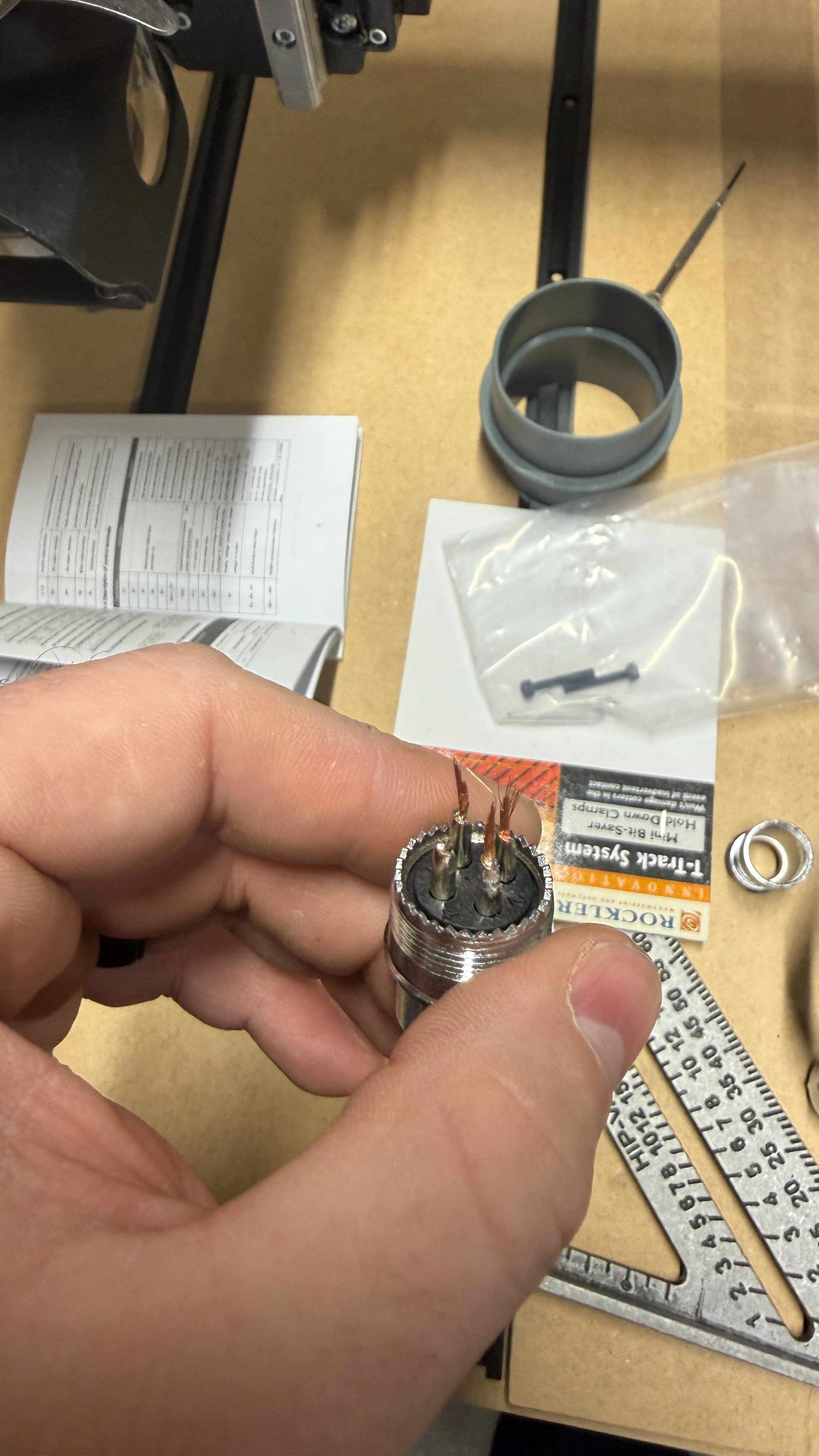 Plot twist - I went to install my dust boot and had to drop the spindle down a bit. When I did that, the spindle wire came out of the plug entirely, breaking the cable. It looks like the number 4 pin had no wire in the solder at all, and the tension relief clamp was completely loose.