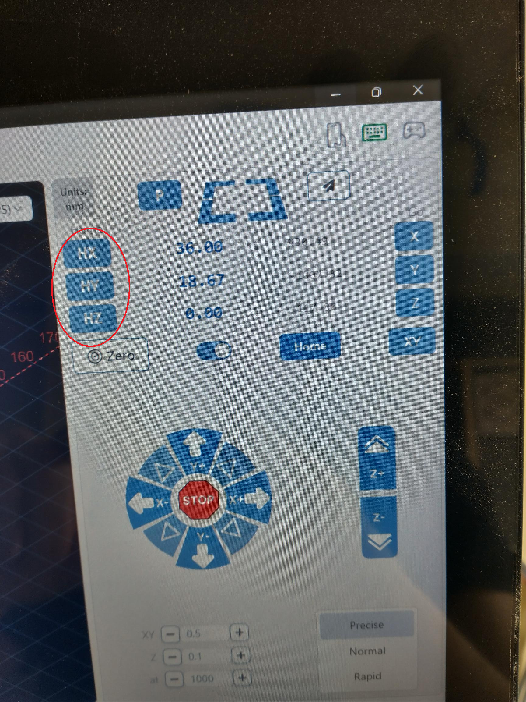 Then, to home each axis separately, click on the HX, HY, or HZ buttons.