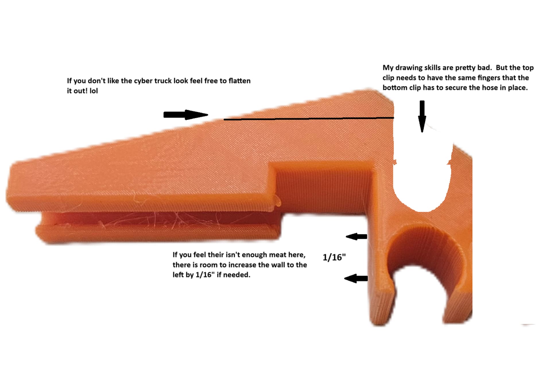 You can do whatever you need to to get the tube holders stacked one on top of another with one pointing up and one pointing down. You can even make it look less like a cyber truck if you want! lol. If you feel that there isn’t much “meat” for the clips, I have measured this and you can build out to the left 1/16” where it over hangs off the chain. The gap there is a little over 1/8” over hang between the foot and the edge of the drag chain. Of course the outside dimension for the cooling hose is 3/8” or .375 but when I measure the diameter on the actual part it comes in at .350 However the diameter on the PwnCNC tube clips come in at .366 and that is still a snug fit but easier to clip the lines in place. I’m using super ethane hose so there is some give there.