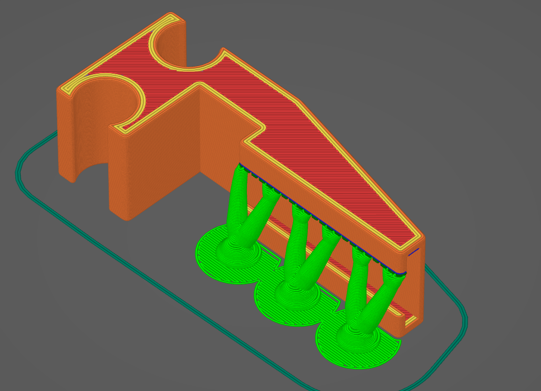 Ill get with Jens to ask more about how to print with support. Jens is right Im wasting too much time with 84 filament changes! But another thought occured to me. the only place i really need support printing this model with the clips facing down and arm in the air is right at the edge of the t track. I wonder if it is possible to design in a string maybe .3 or .4mm in diameter that goes from the top of the foot to the bottom where each t track beginning. I should easily be able to snip this with cutters after its complete. And I will be guaranteed a successful print each and every time. Its on the underside so it will never be seen. and would be far faster than using support. in any case, this doesnt have to be done now unless you have time before you leave. It can wait until the weekend is over! Enjoy you time