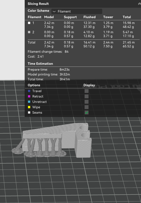 Ok, so I have to add some more info ….. I can only think of one reason you use two filaments. You are using break away filament for the support. There is in fact very little reason to do so and even IF you want to use a special filament for support then be smart about it and only use it for the separation layer instead of the entire support structure. Use the filament that is used for the model in the support structure (which gives you zero filament changes) or use the regular filament for the support structure and break-away filament for the separation layer (this will give you maybe 3 filament changes for this model)