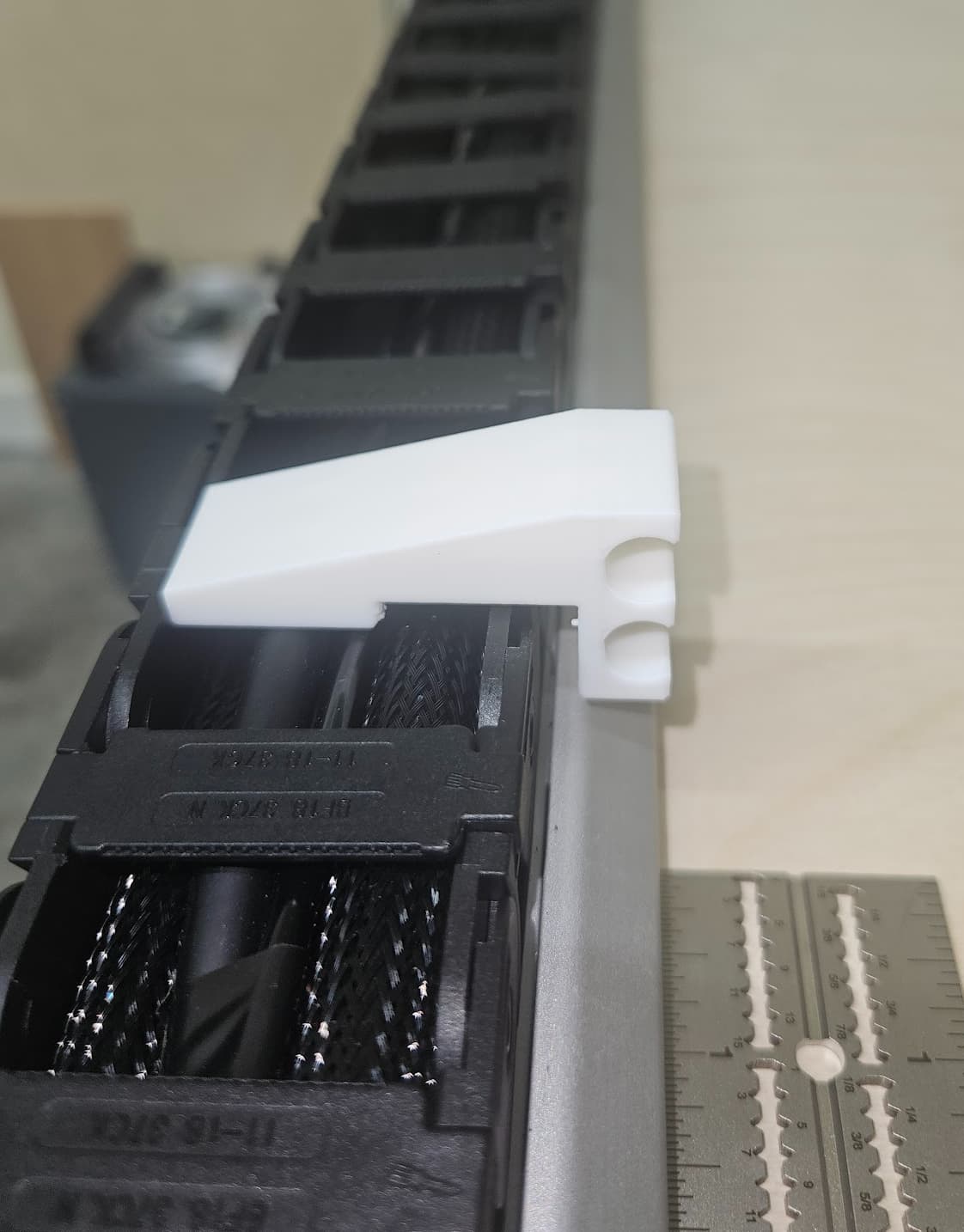 Just completed my test print of version 7. I am impressed with how strong the clip area (foot) is . I was expecting it to be weakened by removing 1.5mm of material but it is strong! Also those supports worked well. They were easy to snip and I got a good print on the ends of those t tracks. Removing the T slots in the middle worked way better than I expected. The fit is tight on the drag chain clips and it does require some force to slide the tube holders back and forth along the clips. I think we nailed being able to slide the clip to the right to allow enough access to unlatch the clip with a small flat head screw driver. That will be great when its time to make changes inside the drag chain wiring. There is only one last item that needs to be resolved. Now that I can latch the drag chain clips I discovered that we also need to delete about 3mm of material from left end of tube holder (the part that still has the t track in place) Or maybe we just delete the last 3mm of t-track on the left side like you did earlier on the right side. That would probably be better. And if its not too much trouble add the 3 mm of t track that you are taking away from the left side back to the right side! That would make the t track be the same length which is about 25mm or 1” Id hate to have any less than that for strength purposes. I just tested the tube holder part 3mm back from the right inside of the drag chain to make sure there is still enough room to unclip the latch for the drag chain clip and there is. anyway the whole purpose of being able to slide the tube holder 3 mm further to the left is to bring the tube clips/foot closer to the y rail. As it is right now, with the tube holder part as far left as it can go, the tube holder just sticks proud of the y rail and with a tube in place it is slightly more proud by 1 mm. As you can see in the photos below on the print of V7, there is about 5.5mm of space between the Y- rail and the back edge of the foot/tube clip. Reducing that to about 2.5mm will still give plenty of room for things to move freely as the drag chain rolls back and forth freely and will give me 3mm more room to work with on the right side of the y rail. (the first photo is with the block pushed back 3mm from the right showing that I still have access to the clip if we extend the track on the right side by the 3mm we are taking away from the left