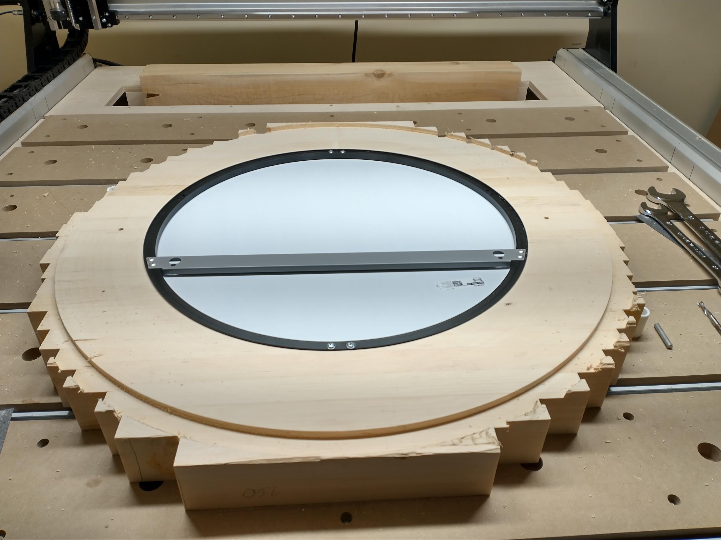 The plywood is screwed into the frame and held down via the t-tracks. Not sure how much I can trust double sided tape yet. I’ve used it to hold down plywood and know it’s strong in shear but you need good contact and this is a 700mm diameter piece which may warp a bit. I didn’t want to chance it.
