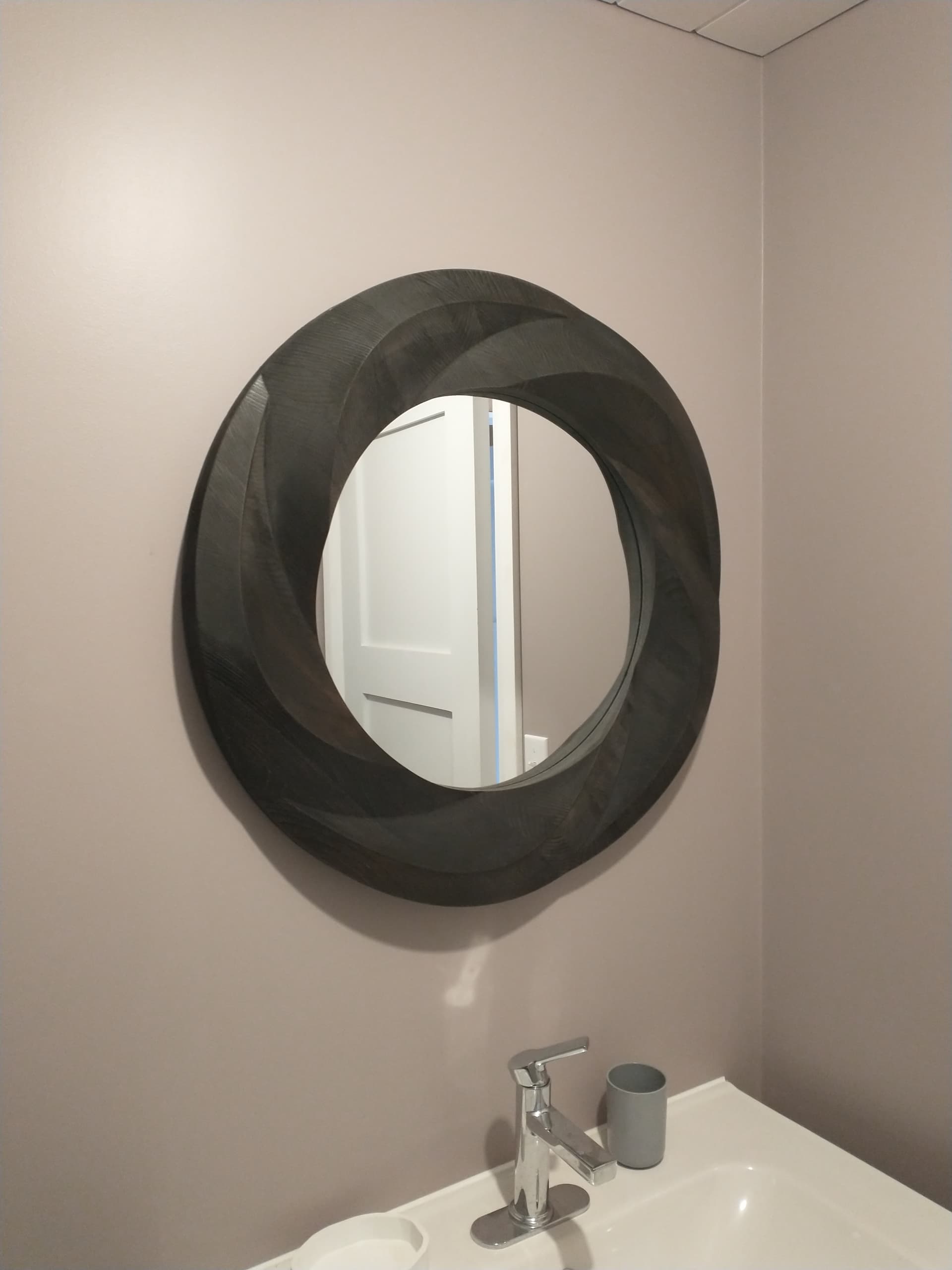 Final product. Much darker than I wanted but that is a result of an oopsies. I knew pine would be difficult to stain without being blotchy so I opted to spray aniline dye. I have a brown walnut which looked good with the first coat but then a large drop of dye fell off my sprayer onto the workpiece. Bad technique in my part and there was no way to fix it except to apply more dye to the entire piece. Still looks nice with our colour scheme and certainly good enough for the cottage bathroom. Another lesson learnedā¦place your piece vertically when spraying with this particular gun.