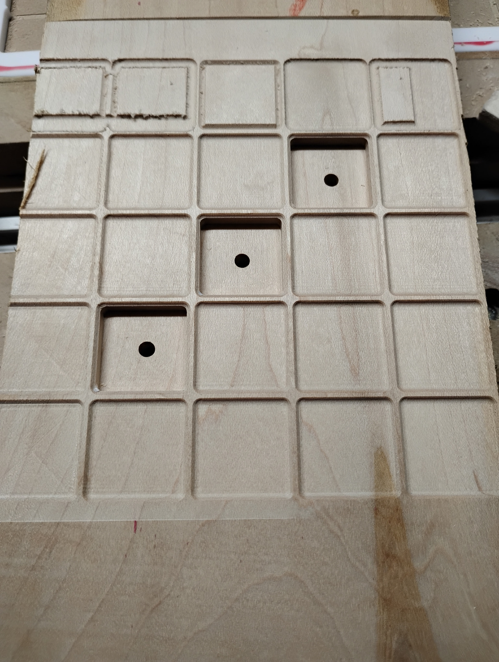 I had tried the pocket cut using the offset method but it left diagonal marks from each corner to the centre. You can see those on the left side pockets. The raster cut leaves a nice finish that won’t require sanding.