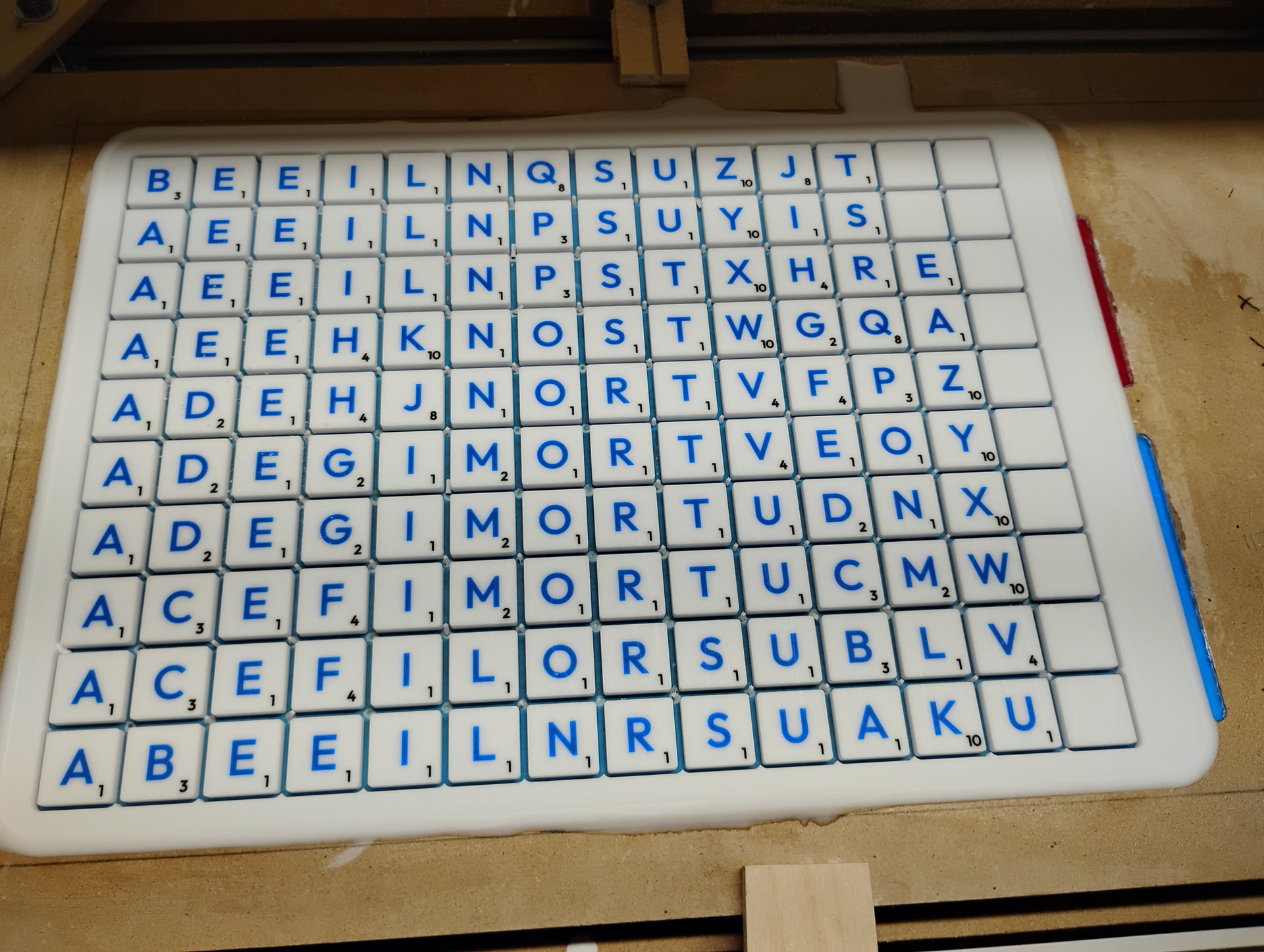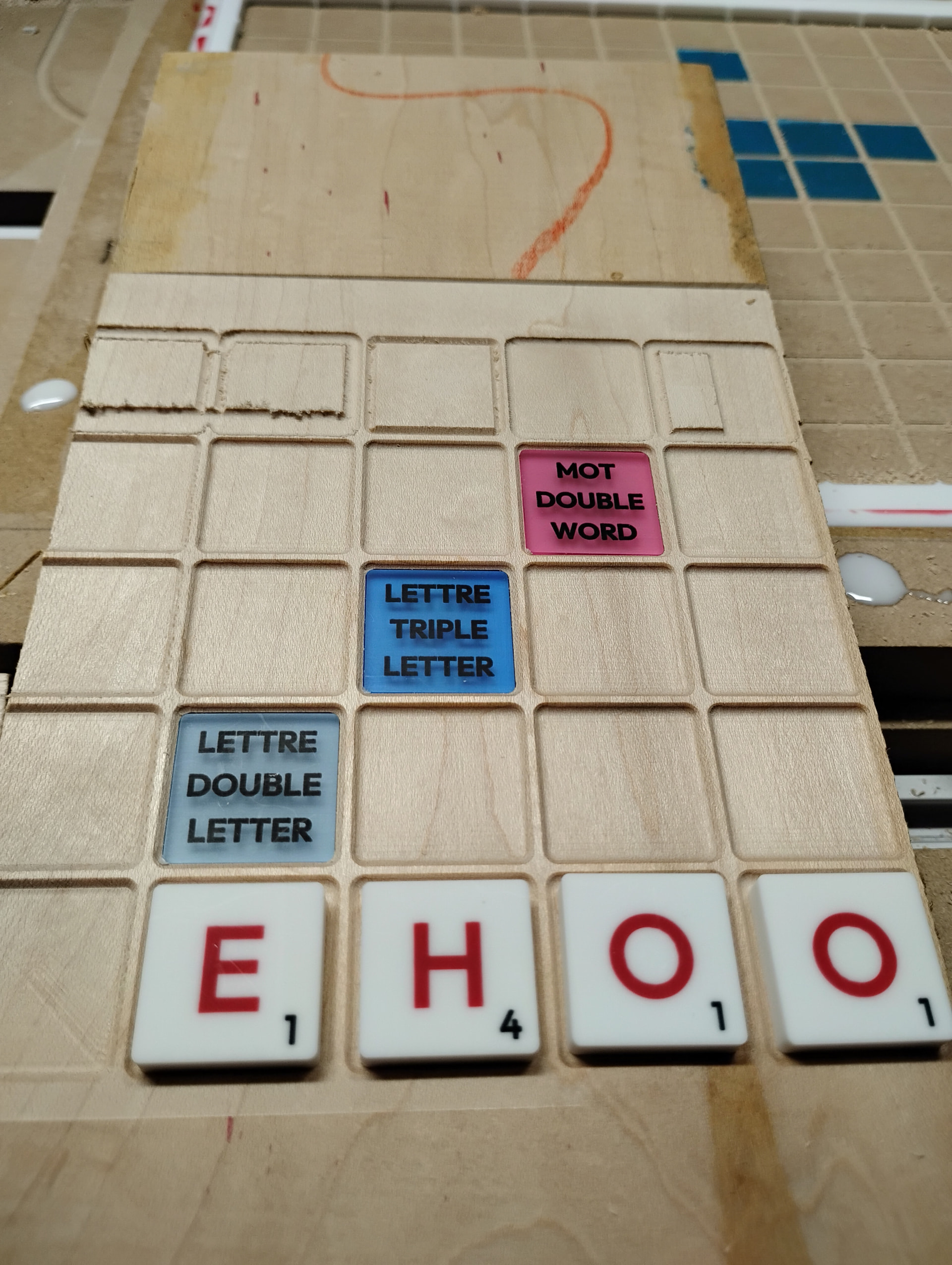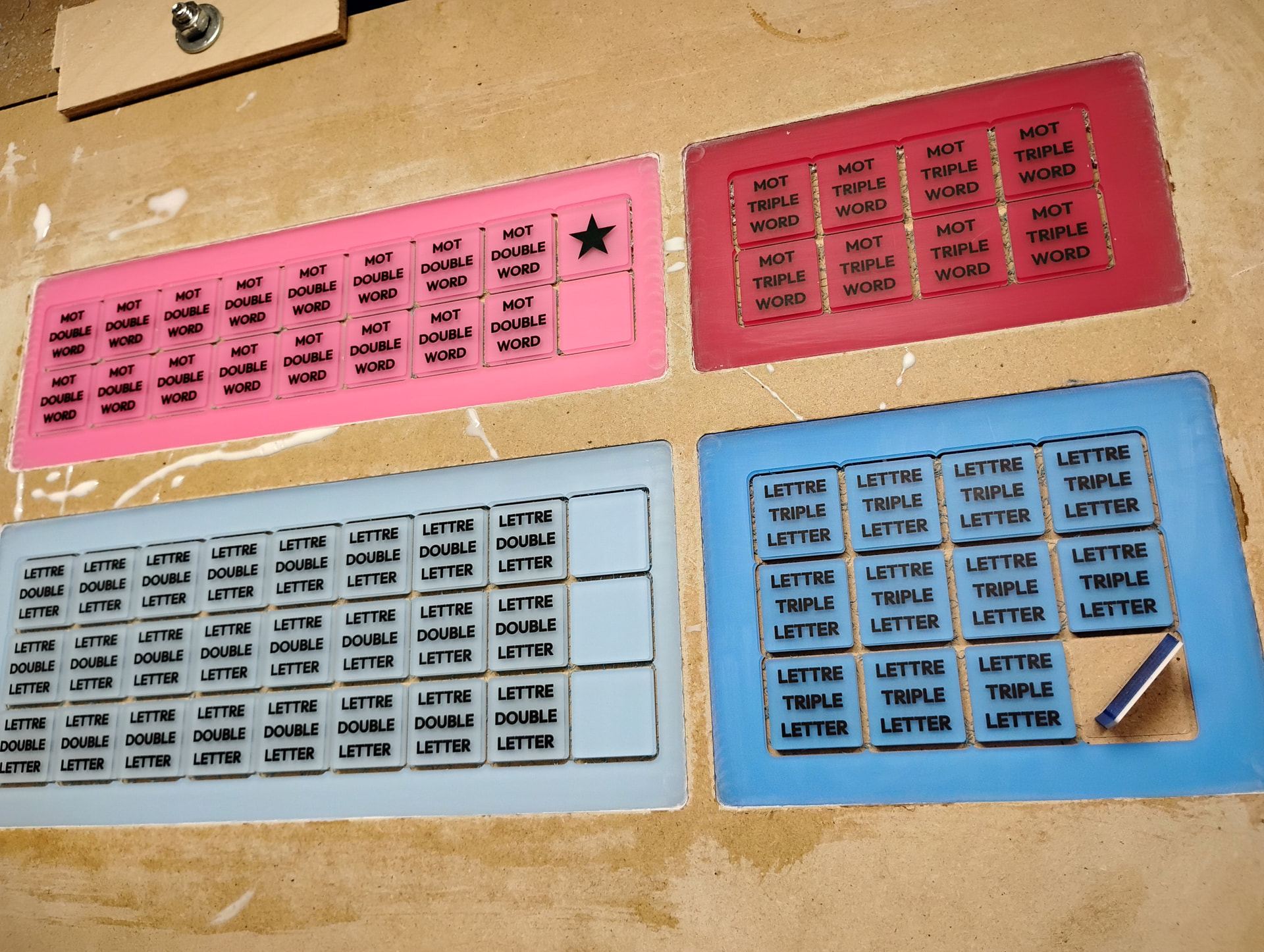 I was originally thinking of doing two boards, one in English and one in French. But as it turns out, French and English grammar makes it that I can do one board for both. But I’ll still need one set of tiles for each language because the points are different.