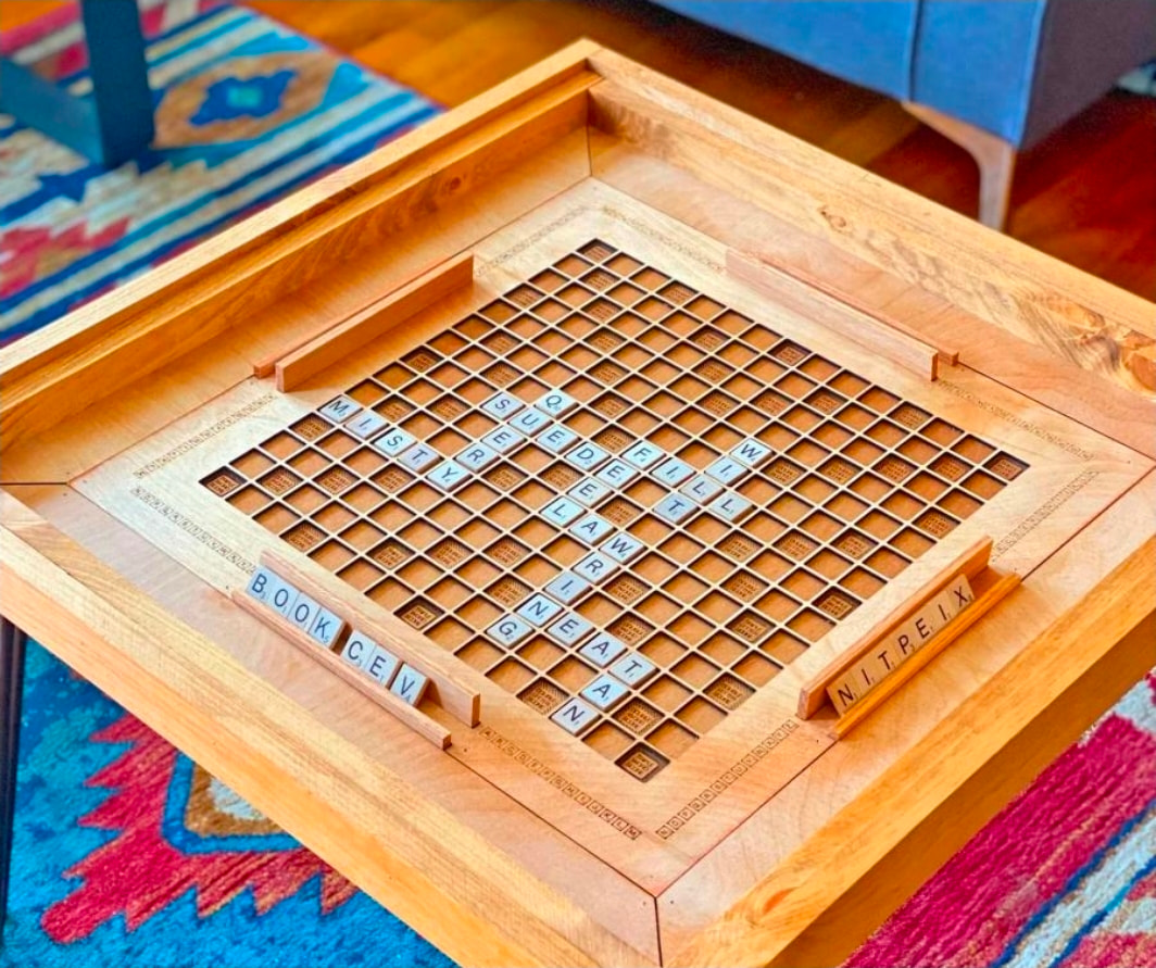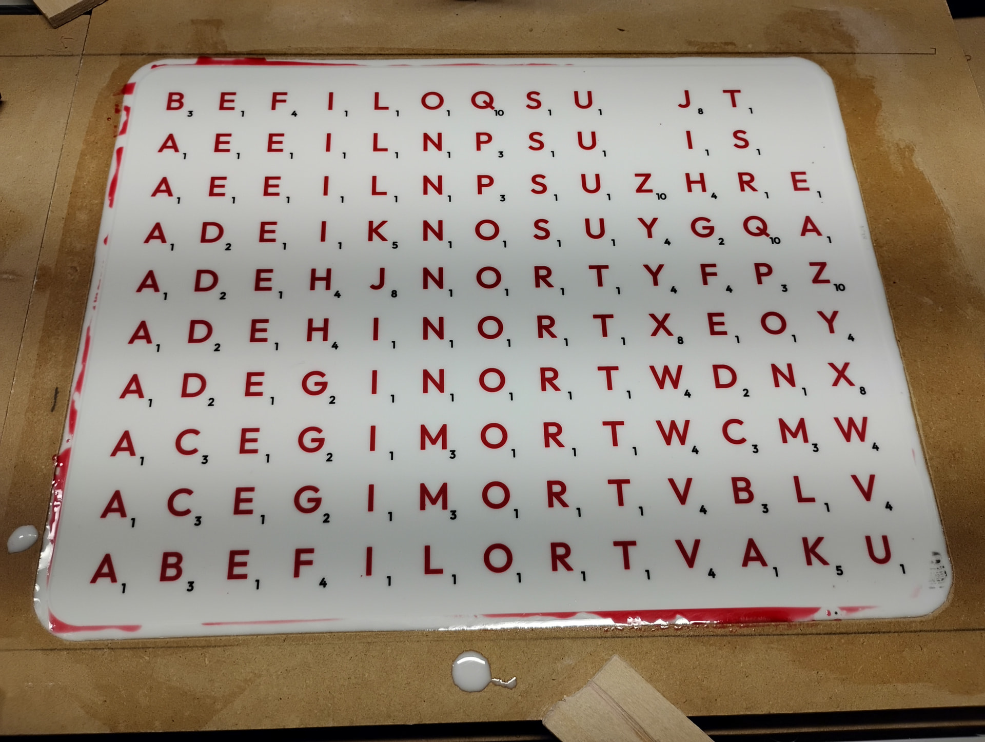 The double/triple word/letter squares will likely be inlayed with translucent epoxy squares made like I did the tiles. The other squares would be the natural finish of the maple.