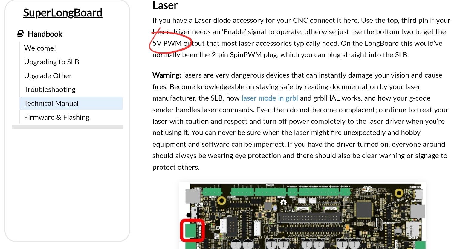 I have not looked deep into compatibility of the slb with the laser tree controller board, but I thought I saw the lt controller wants 12 or 24v pwm controll? That might you needing a stepup adapter between the slb and the controller. Again, I only swept the manual of the laser so I could be wrong here. Will take a look after posting and might be back soon.