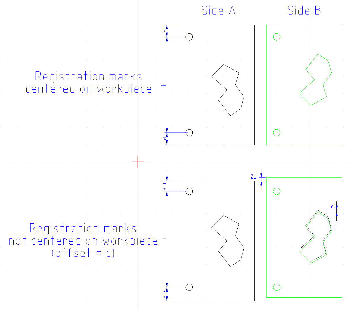Edit: Iām pretty sure the statement below is incorrect. In fact, I now think that the registration marks need to be centered on the workpiece. While easy to do on the model, it might be difficult to accomplish in practice unless you can position your workpiece fairly accurately on your spoilboard.