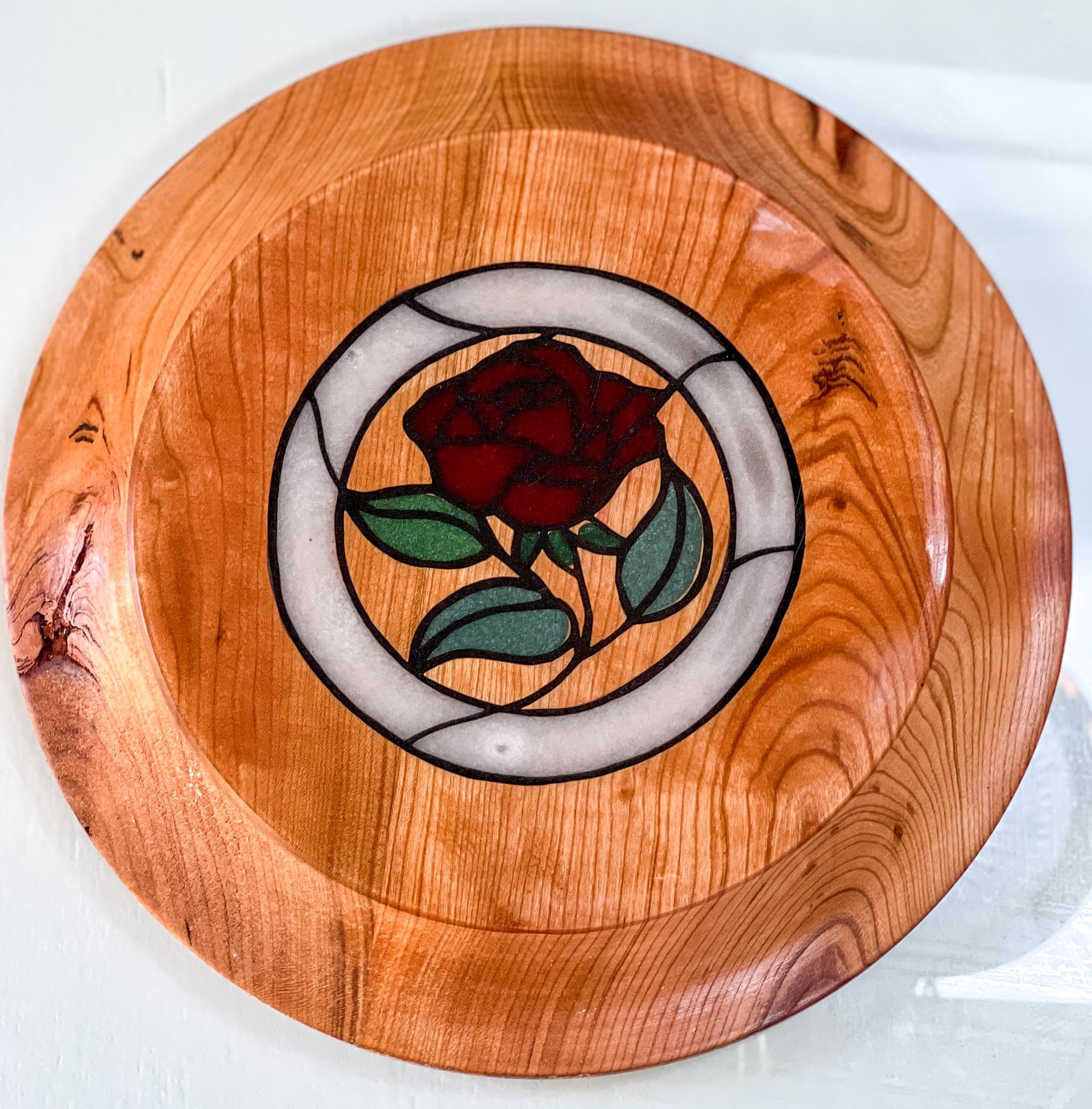 Did this epoxy inlay for my wife based on a stained glass window she liked. Had a piece of cherry log that I milled to get a 9x9 plank then used Vcarve and longmill MK2 to pocket mill the voids for the colour epoxy fills then did a 30 degree vcarve to create a void for the black epoxy. Surface milled with a 22mm bit then mounted on my lathe to make it round and finish the edge.