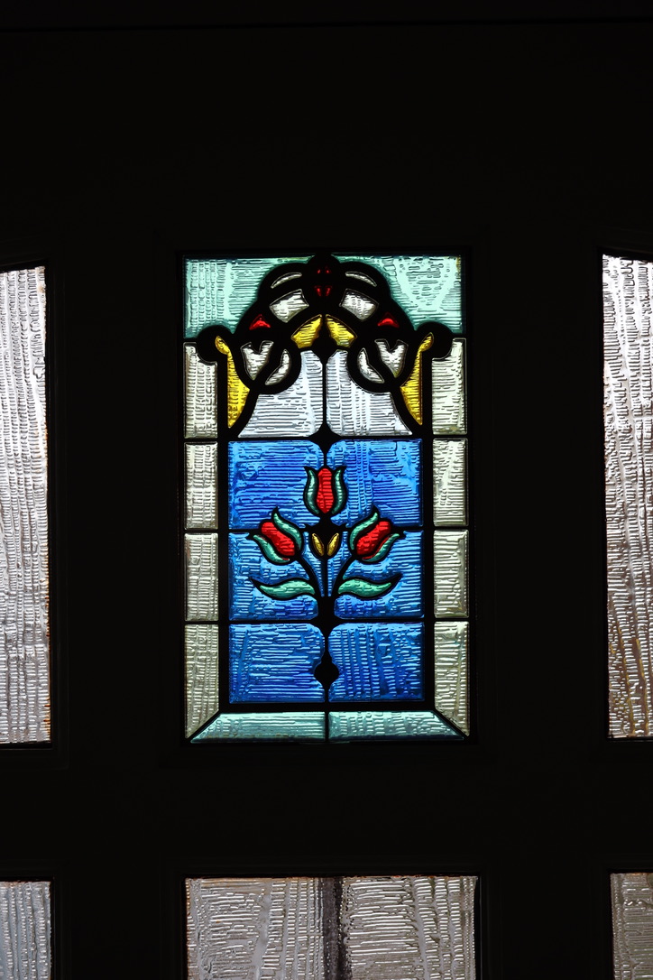 Mounted in a door window, the door’s glass is ‘wavy’ hence the appearance but the ‘stained glass’ is super-high gloss without needing any polishing.