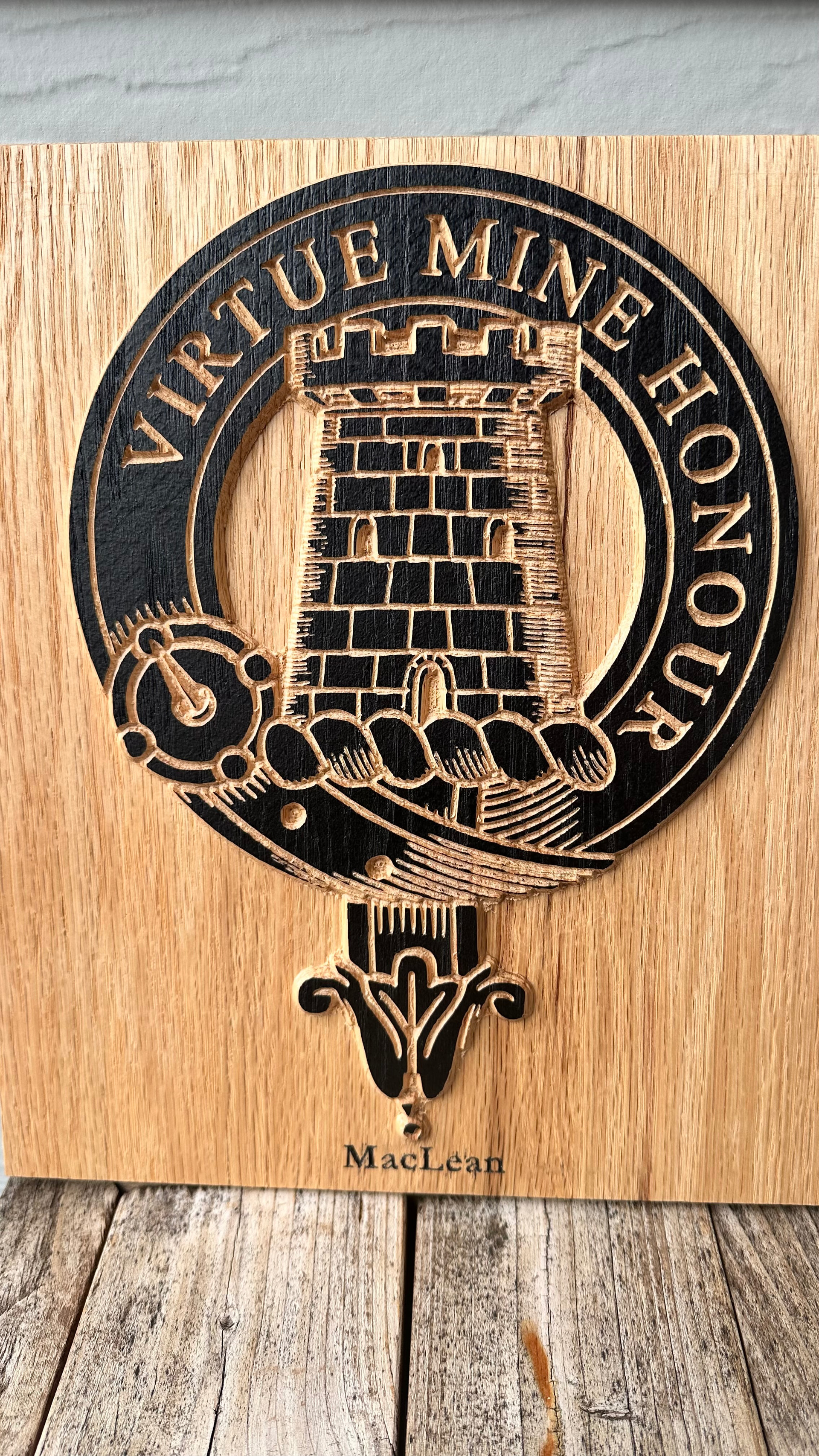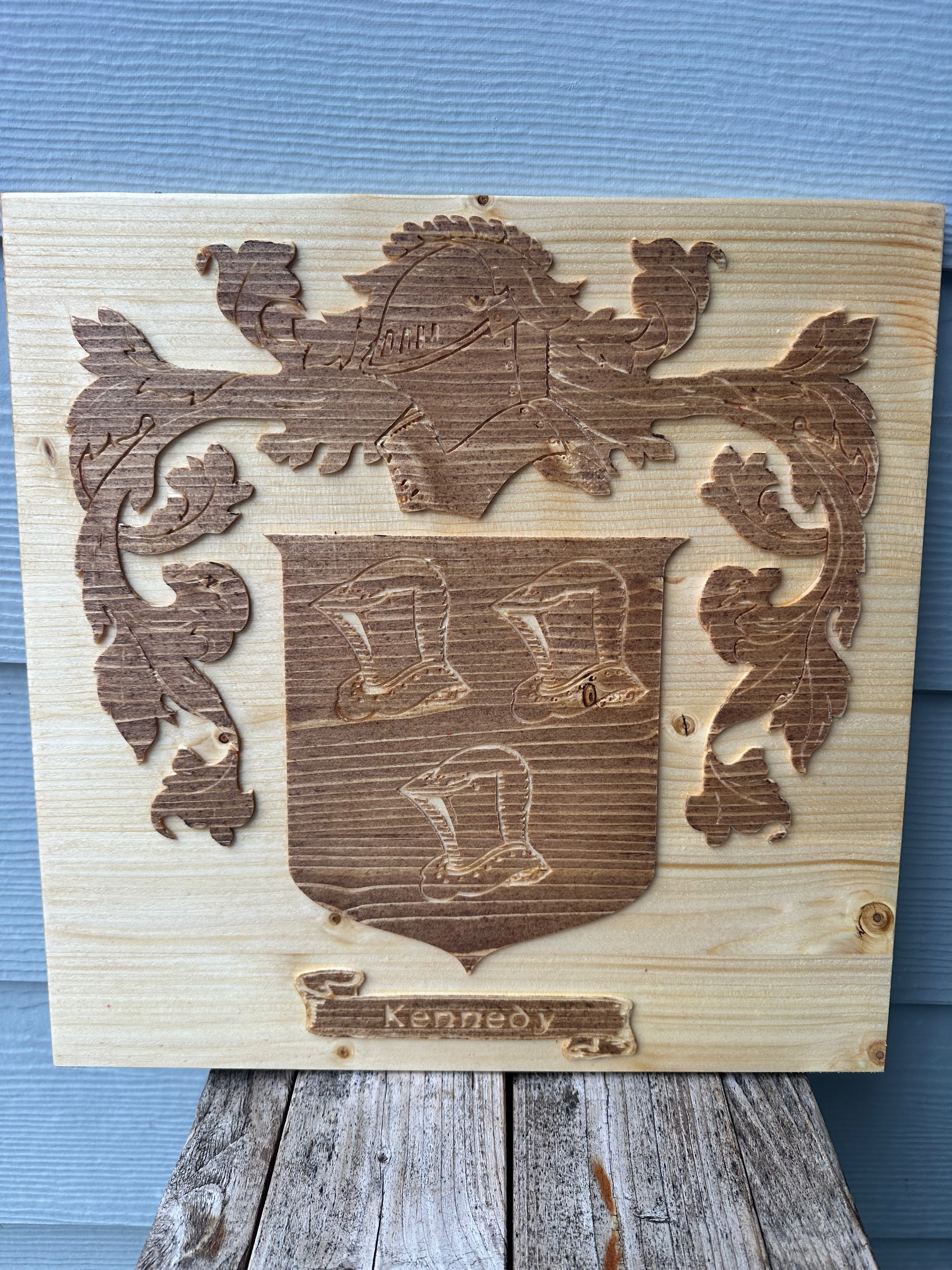 The Kennedy and MacLean are real crests for friends. The Kennedy design one was ugly and hard to make look good carved. What would you have done differently on the “Kennedy”? Used AI to help with the vectors. Total time saver! Used a 1/8” tapered and 1/4” downcut. All others were 60v and 1/4” buts.