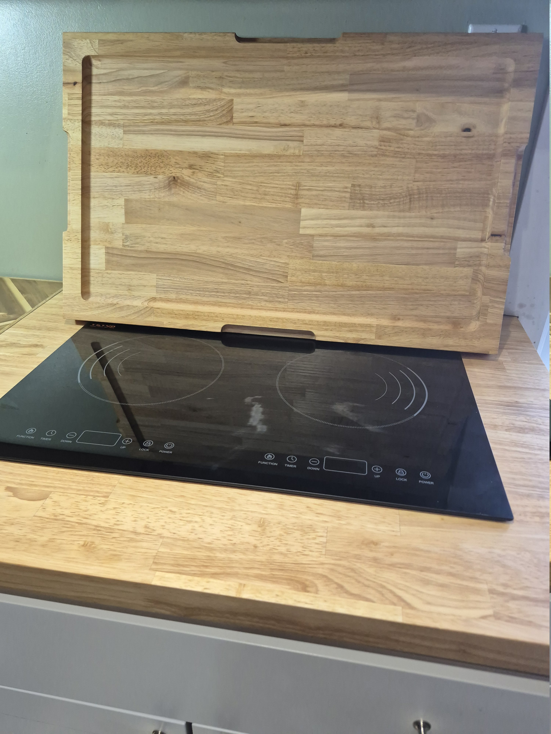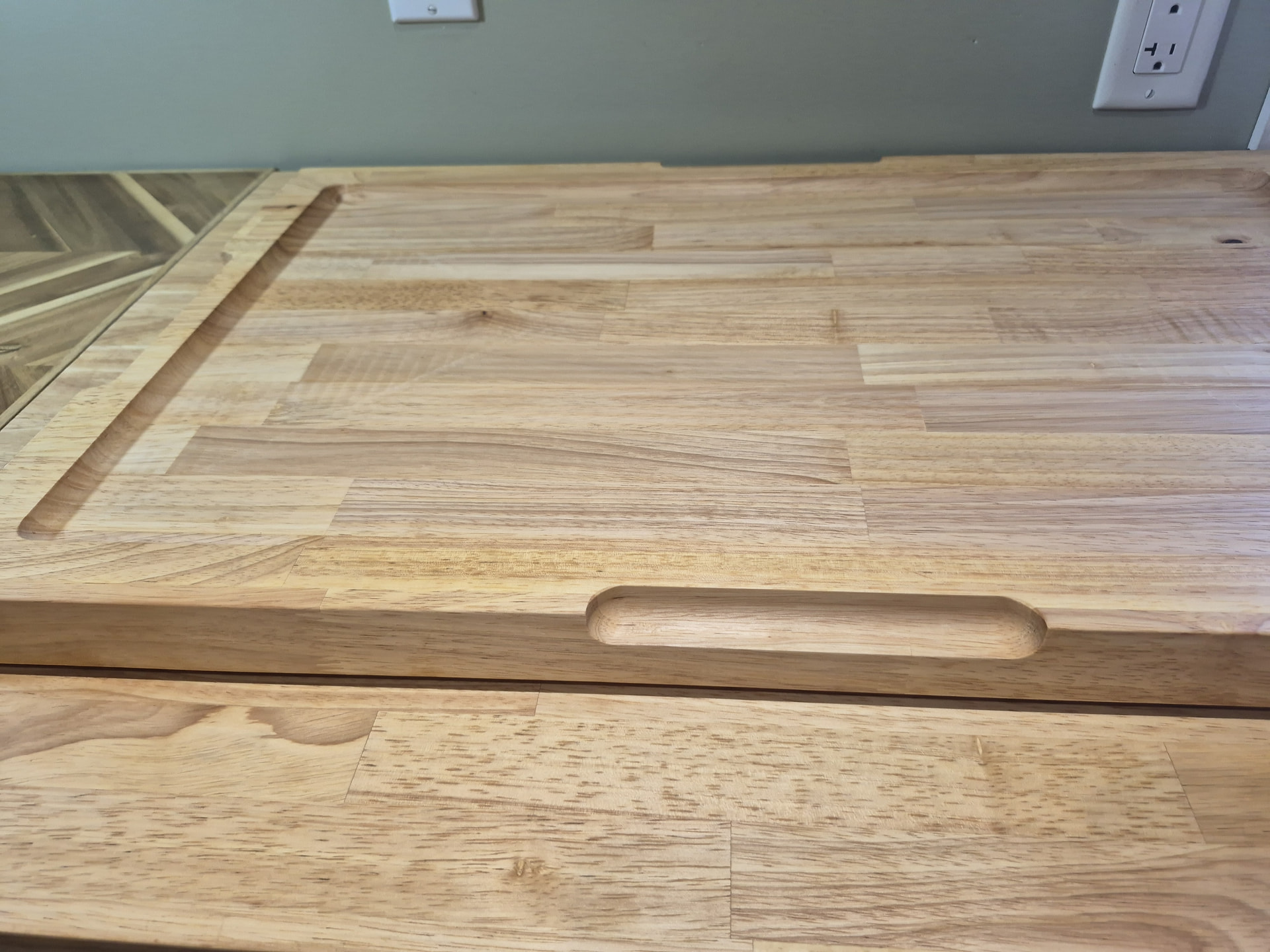 I had a piece of Acacia hardwood countertop left over from when I made up the stove top cabinet. It’s been on my project list to make a wooden topper to protect the glass stove top for a while, but Acacia is no fun to work with. When I originally cut the countertop material my traditional power tools complained a bunch, I was in no hurry to get in there with hand tools and make the final addition to the stove cabinet.