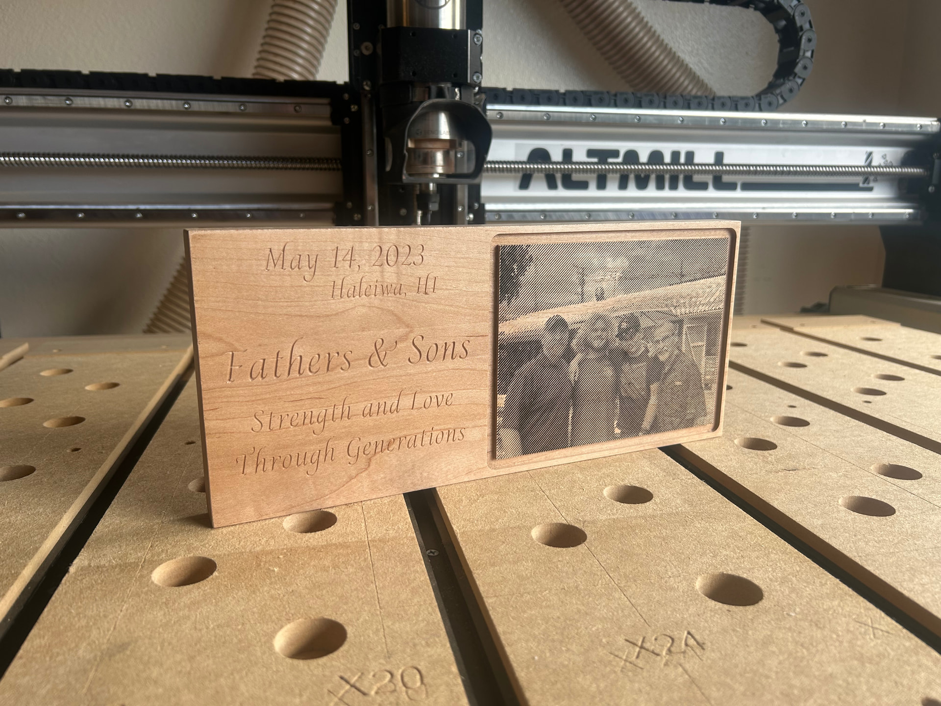 Thanks! I used a 60 degree vbit for the photo and wording and a 1/4” downcut end mill to frame and highlight the photo. Then just used a block plane to knock off the sharp edges.