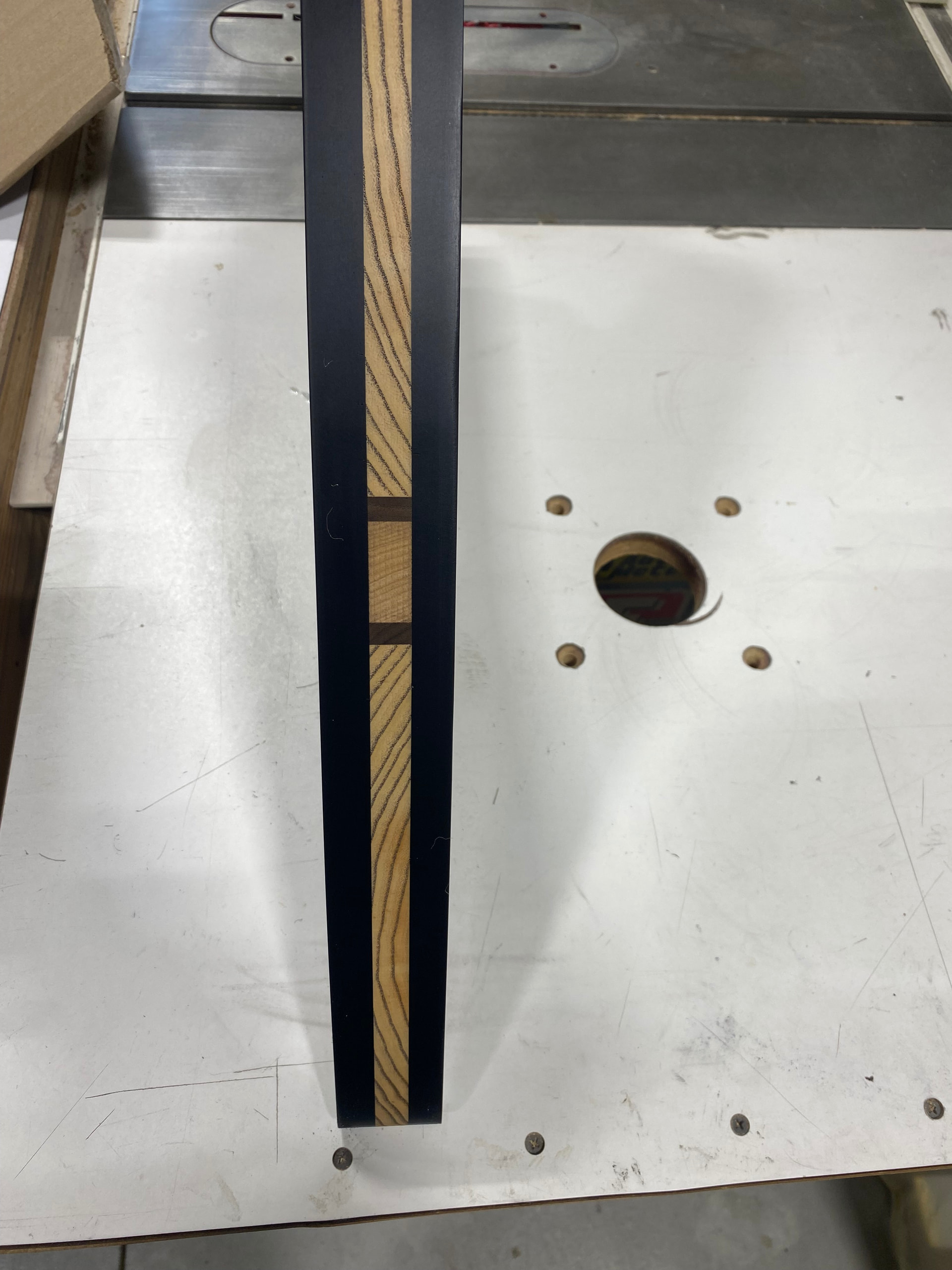 Since the thing was going to weigh a ton, I did some chambering to lighten the load. The piece of ash I was working with was just a little narrow so I added a couple of strips of black walnut and a piece of bird’s eye maple to the center to make up the difference.