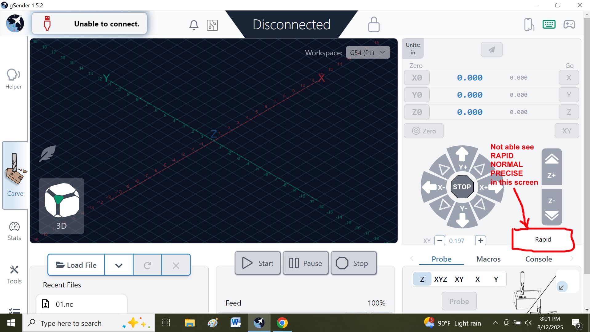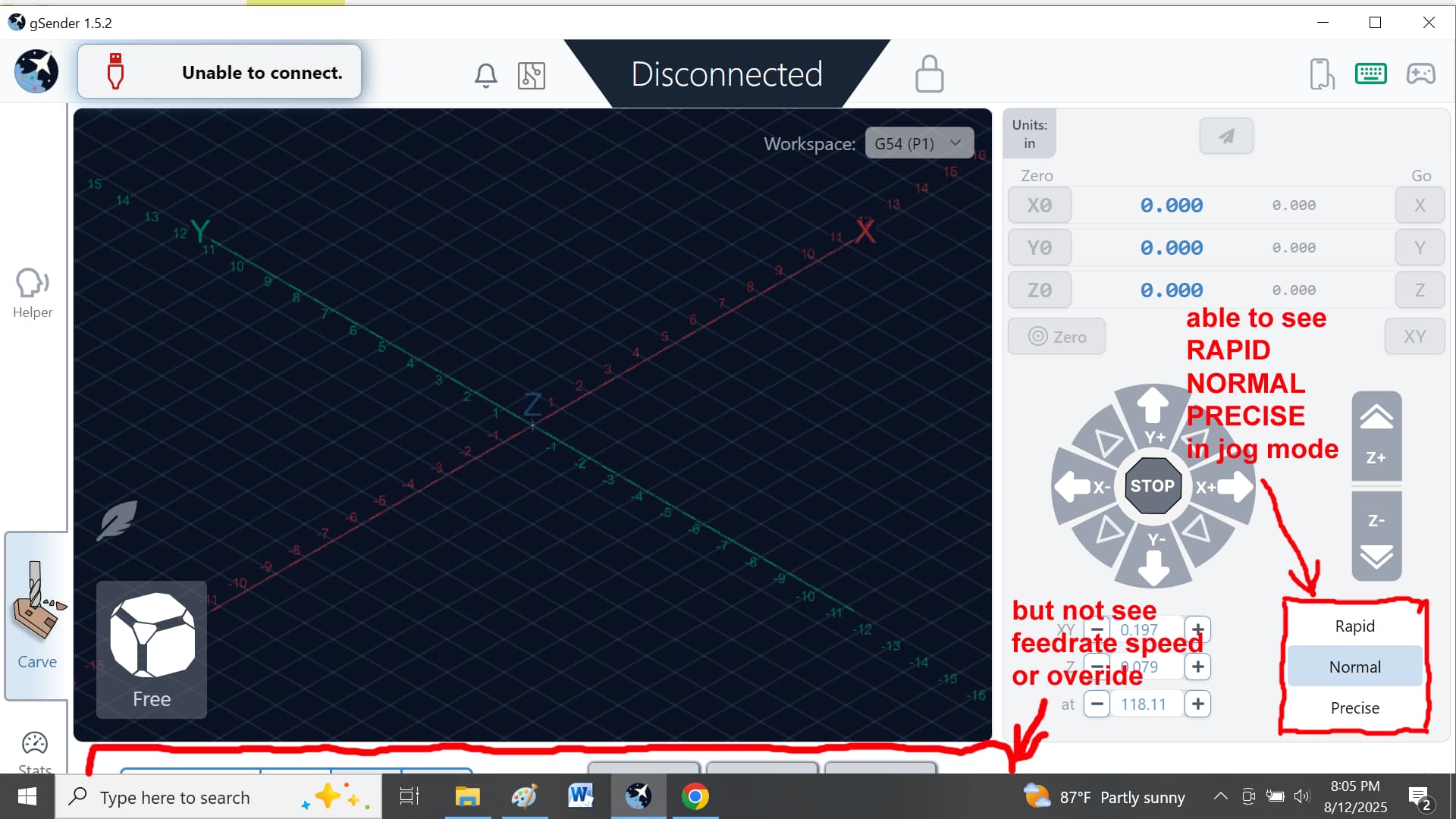I am having a problem with the g-Sender display screen on my computer. When I have g-Sender in maximize the screen display cuts off the feedrate, feedrate override, start, pause, and stop buttons. But it displays all three buttons for jogging, (RAPID, NORMAL, and PRECISE).