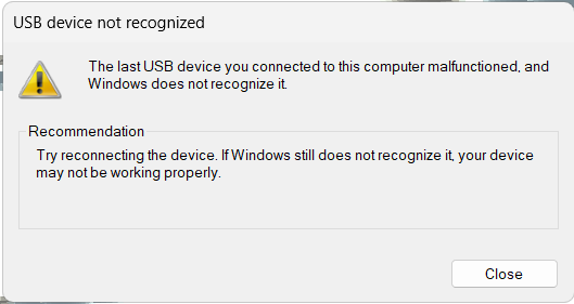 gSender is starting to randomly disconnect. Windows states that it doesnât recognize the USB port, and disconnecting the Controller connecter doesnât help. If I turn off the controller, restart it, it connects without an issue. I am using gSender 1.5.6 and Windows 11. I never had any issues before yesterday and as far as I can tell, nothing has changed. Any suggestions?