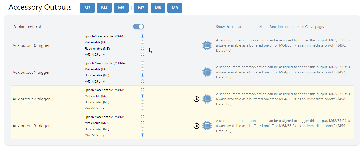 Im having an issue when i tell my spindle to go forward it starts up but 1 second later the SWT1 activates with it. which jsut so happens to be what controls my ATC tool release. so it turns on then 1 second later activates the switch, and sends my tool flying. is there something in the settings that tells the mahcine to turn this on with the spindle? not sure if its like a msit or flood cooling thing? anyone got any ideas?