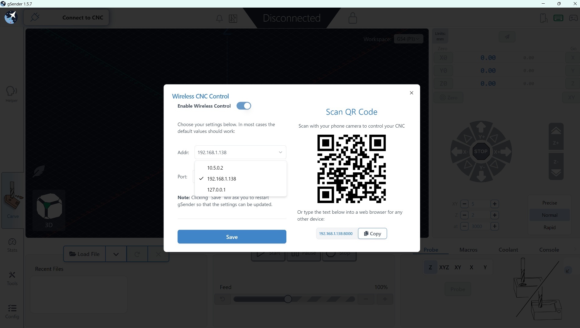 When I try to set the IP address in gSender 1.5.7, I am presented with a list of preset IP addresses, and I am not allowed to set my IP address. Is this a bug, or am I just missing something? I looked online, but no luck so far.