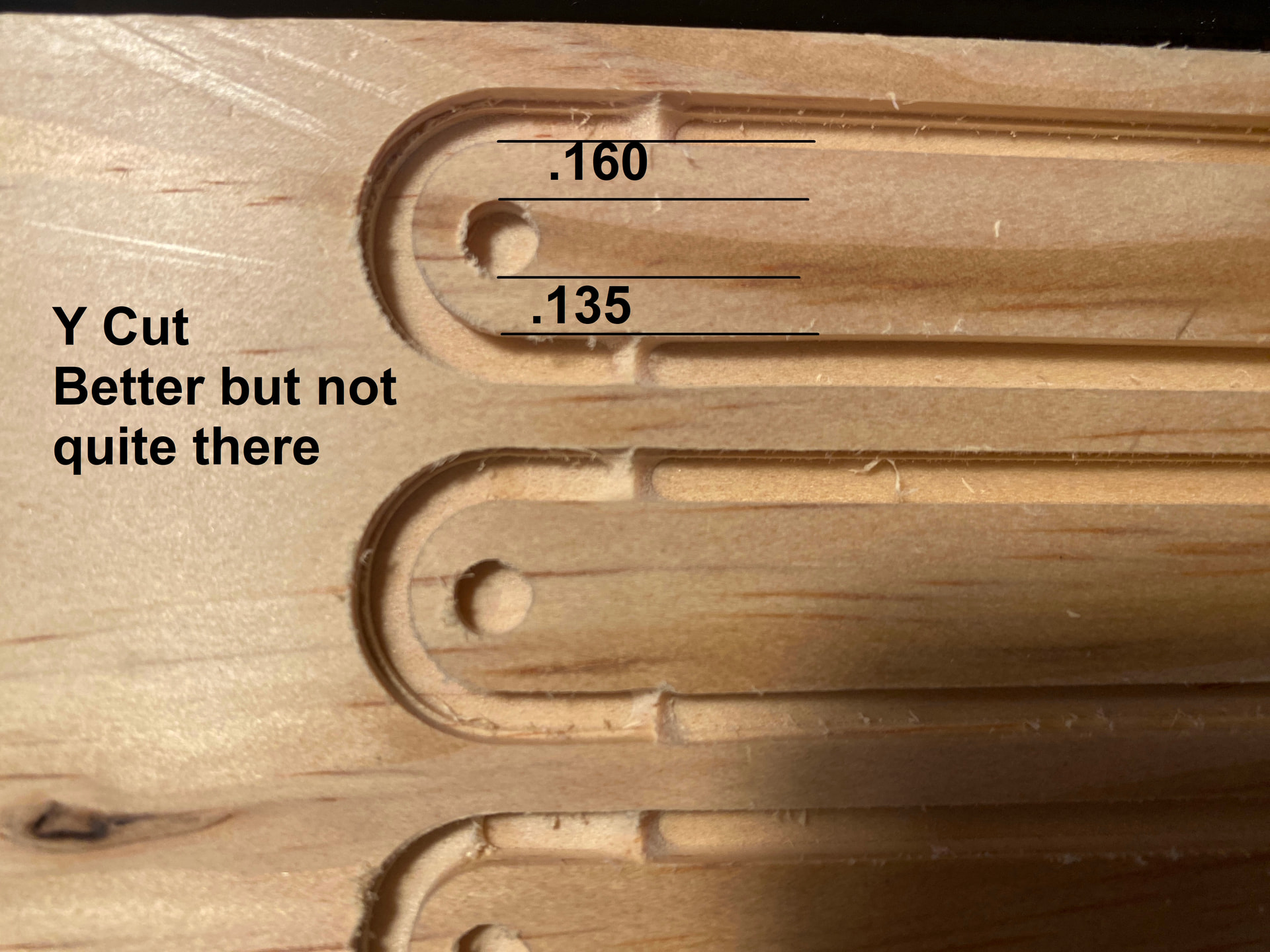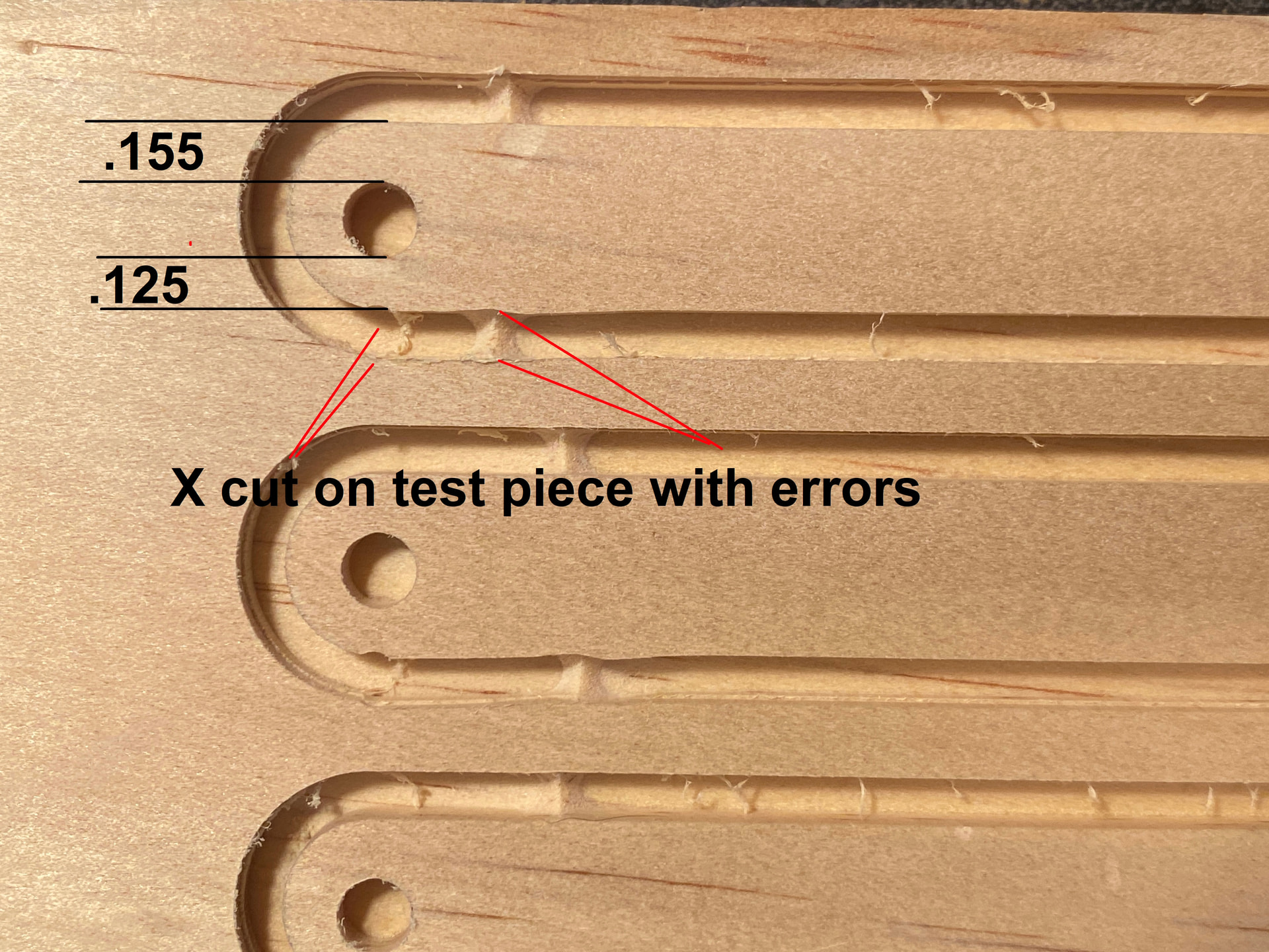 The test pieces are ½” thick to test of stock movement and bit wander with the .125 depth of cut. The stock doesn’t move, but the bit is “wandering”