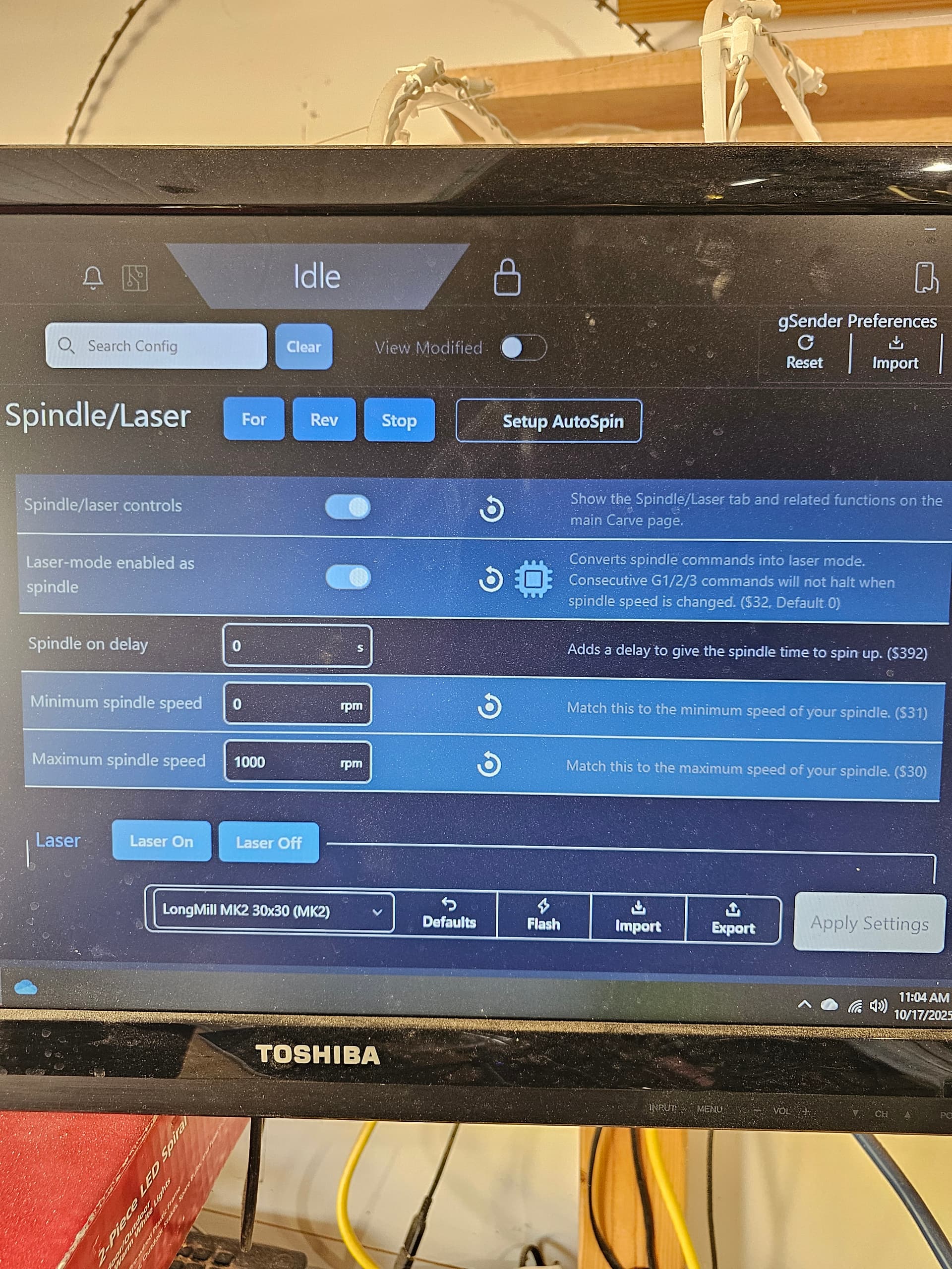 @TechMonkeyMatt You are mistaken about what those settings are. $31 is min = should be 0. $30 is max = some use 255. I use 1000. $32 is laser mode off and on = should be 1 when on, 0 when off.
