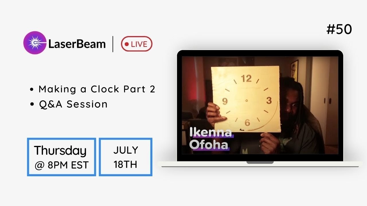 Ikenna will continue to make a clock with the LaserBeam Sienci LaserBeam Laser System | Sienci Labs. As always, he will host a Q&A session, so ask your questions and get live answers!