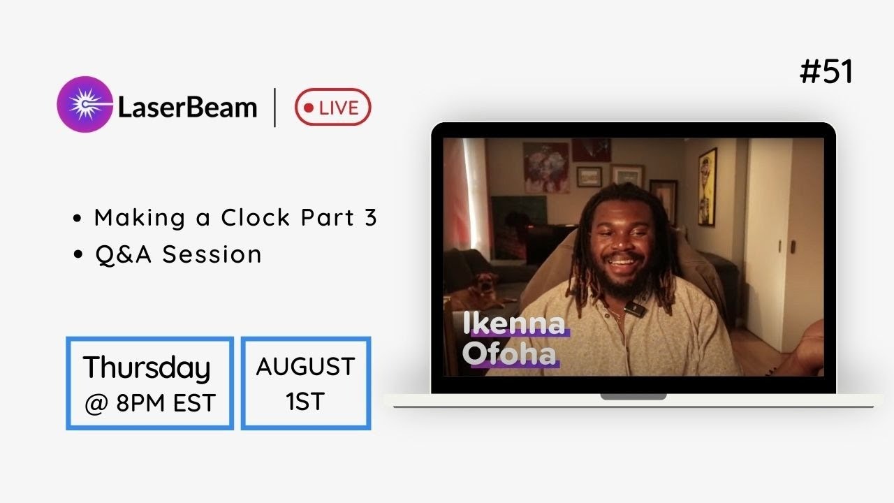 Ikenna will continue to make a clock with the LaserBeam Sienci LaserBeam Laser System | Sienci Labs. As always, he will host a Q&A session, so ask your questions and get live answers!