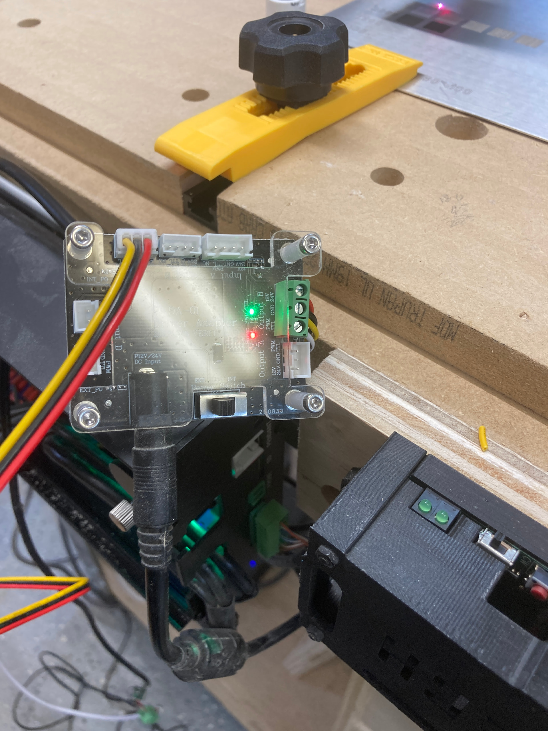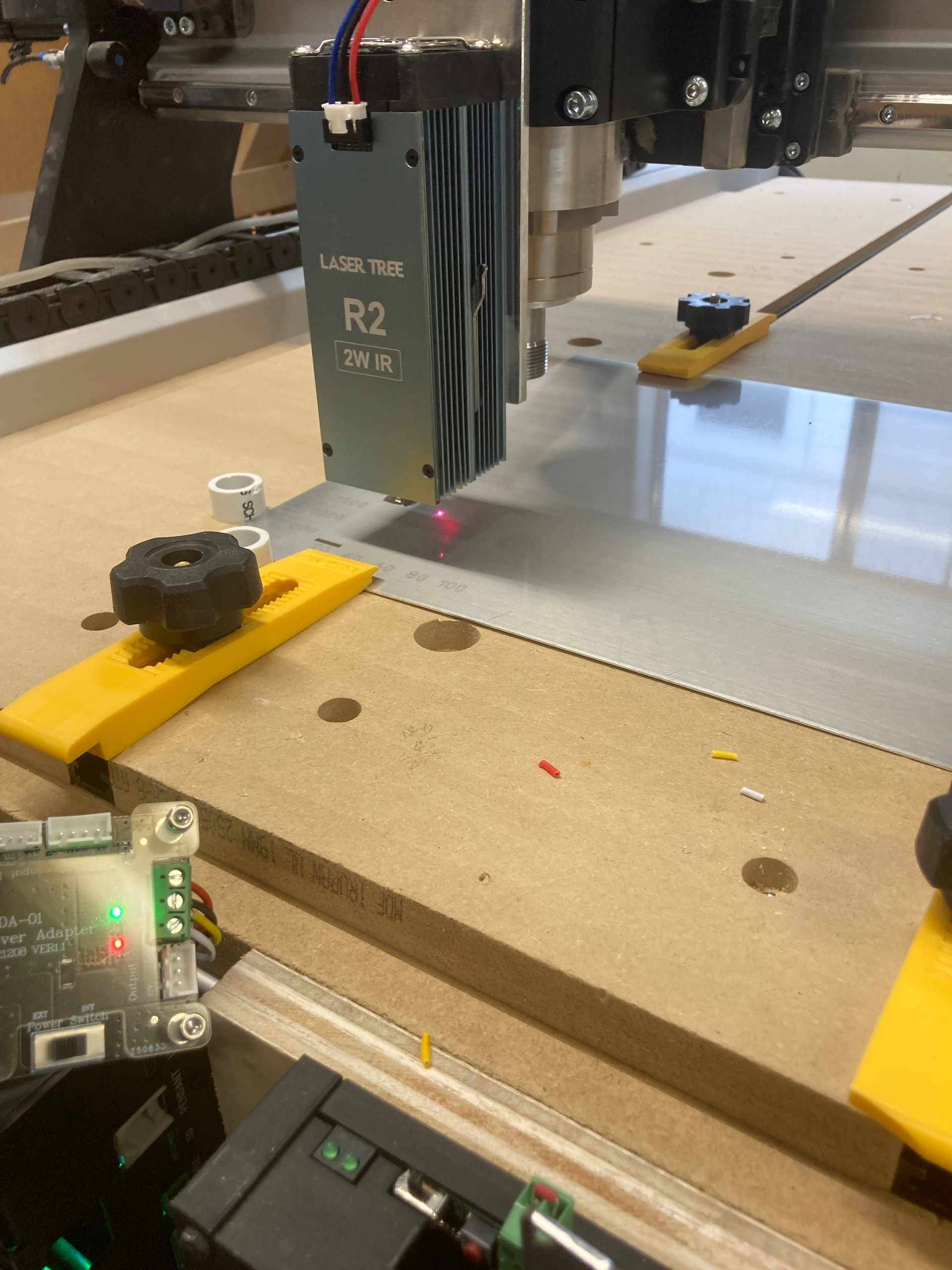 Got a LaserTree 2W IR laser module functional on my AltMill. A bit of a Frankenstein arrangement right now but got it working and first sample etch on brushed aluminum came out pretty nice.