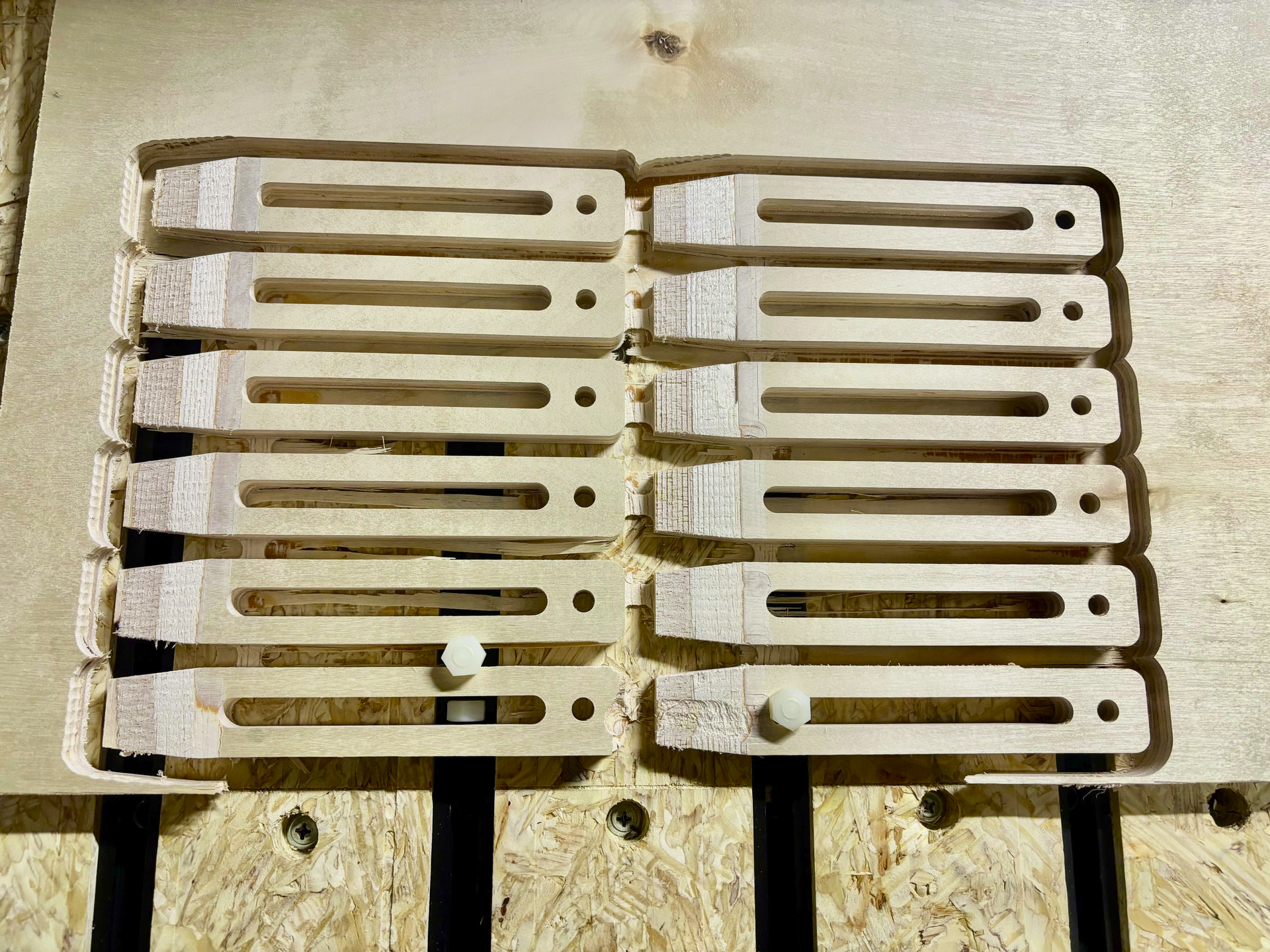 I made up some clamps in Fusion 360 and completed my first semi successful batch. I had to stop mid way through to add some additional clamping. This was due to the corner not being held down enough and my taps got cut out. Its very satisfying just having that super thin skin of wood to peel away!!