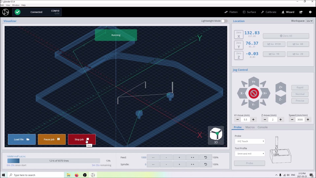I ran a toolpath that was made up of 4 passes of increasing depth. The sender ran 3 of the passes, and then returned to XY0 as if the job was done. I mistakenly clicked on stop job before I realized that the job was not finished. I started it again. I had to run in air for the first 3 passes, but then it cut the final pass.