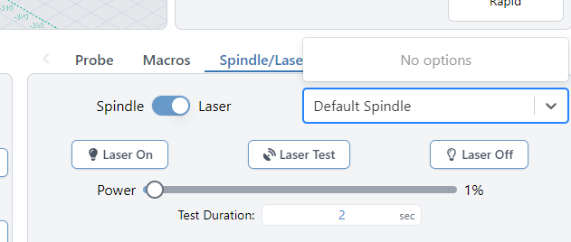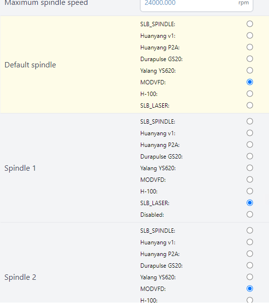 AltMill running gSender 1.5.7(?). Today out of the blue, I have no options available in the Spindle drop-down under the Spindle/Laser panel. I have run a laser for months with no problems but now I have lost both the VFD and SLB-Laser device options in the drop down menu. As shown in the accompanying photos trying to select the SLB-Laser option in the SPindle/Laser panel shows no device options available but both the Default Spindle, Spindle 1 and Spindle 2 options are set as they have been for the past many months. As far as I know I have not changed any settings and everything has been working great up until today. I’ve tried resetting these parameters with hard reset of the SLB a few times and no joy. Any thoughts?