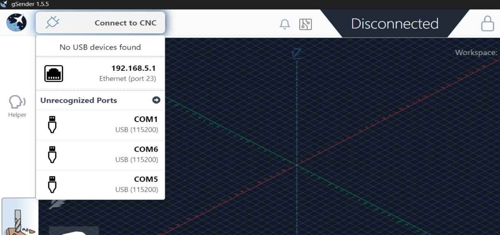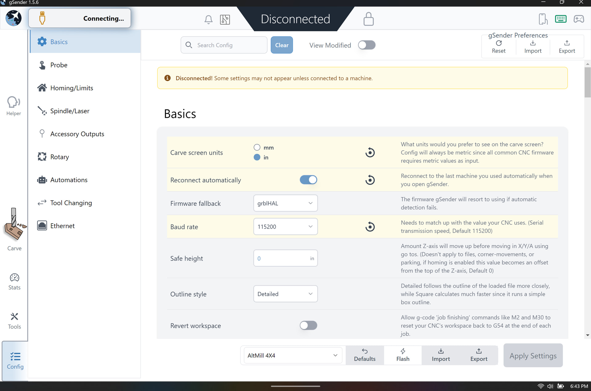 The current state is that gSender constantly displays “connecting” regardless of USB connection, meaning with nothing plugged into the laptop, it also says “connecting” almost immediately upon opening the program. Plugging the USB in causes Windows to chime in acknowledgement with no change in gSender. Hovering over or clicking the “connecting” icon has no impact.