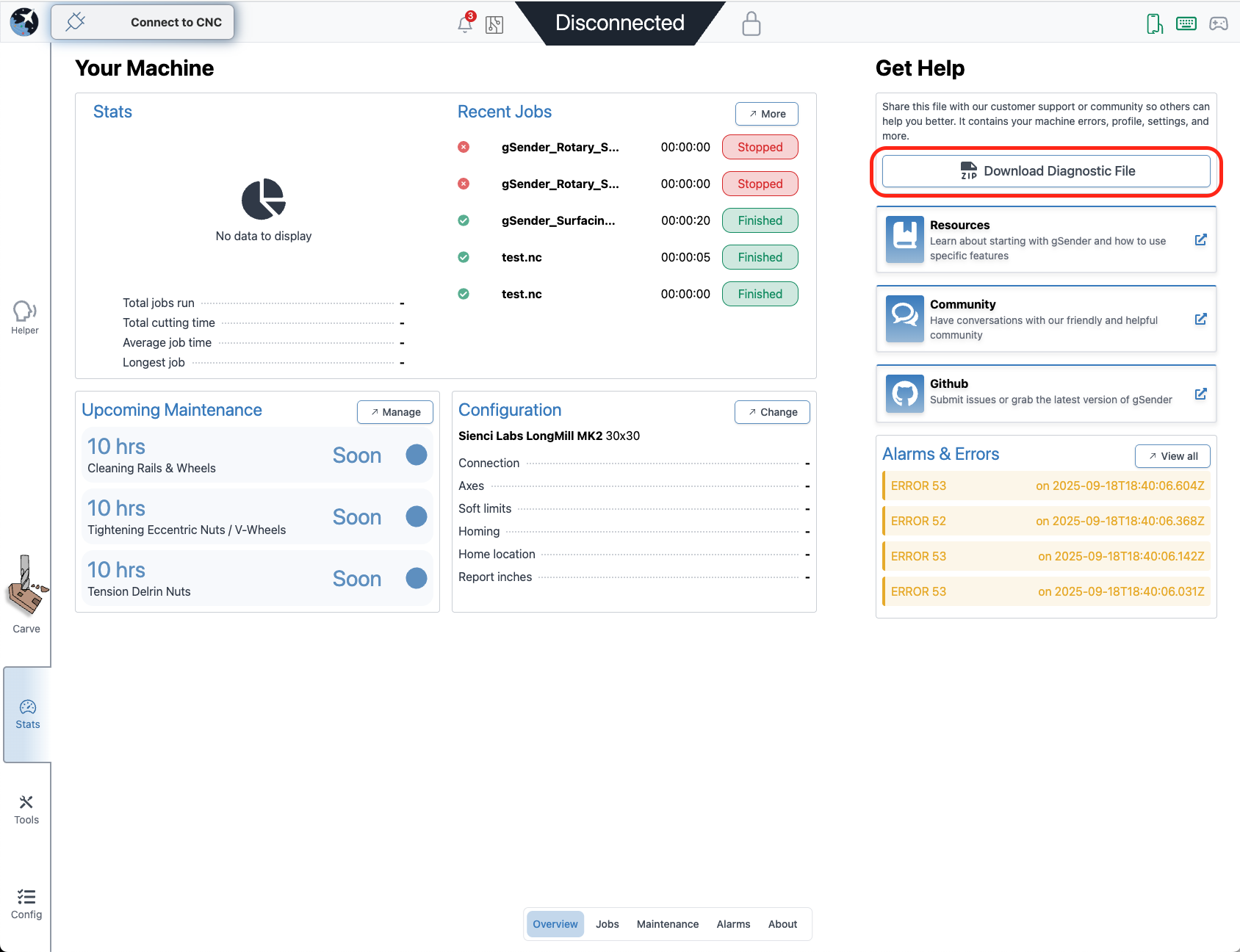 No job total no record of alarms and the download diagnostic file button is nonresponsive.