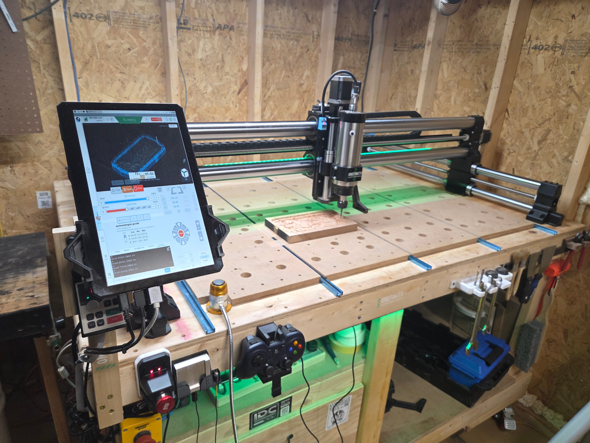 I just finished up with the main steps of converting my Onefinity Journeyman from Buildbotics to a Super Longboard. I started this because the Buildbotics controller just did not meet my needs. The SLB has so many features that the B.B. did not. I tried to use as much of the original parts and wiring as I could (cheap) I used the original steppers (have the z20 z axis), the original motor wires, screen (10”) and touch plate. I have a 2.2 kw er20 spindle and vfd (Zhong Hua Jiang with H100 VFD) as well as a raspberry pi 5. Put a 256gb m.2 nvme SSD hard drive in the pi. I’m running gSender on the pi5 hooked up through ethernet to a 5 port switch, Slb is hooked up through ethernet to the same switch. both have static ip’s. using the 10” touchscreen on the pi is a little rough, my eyes are not what they used to be. I installed sn04-N2 npn nc proximity sensors (front facing, square sensors) on the X, both Y rails, and the z axis. For the switch mounts, I found some on Makerworld and thingiverse but had to modify them to suit my needs. Z axis was the trickiest one to mount. Wiring the motors was pretty straight forward. Onefinity uses a crossover inside the tubes, keeping that in mind the wiring goes black A+, blue A- , red B+, green B-. I set the acceleration to 250 on all axis, travel resolution on x is 399.348, y= 638.95, z=634.92. microsteps at 32. I flashed the firmware with SLB Alpha B5.0.10 AS so that I could utilize the auto square. after the machine was running and calibrated I installed the Onefinity touch probe. had a little bit of issues getting it going at first. I also installed a tool length sensor. Both did not seem to work together at first. no combination of $6 and $668 would let them both function. so I tried wiring the probe to the tls port and the tls to the probe port. with $6=0 and $668=1 they both work perfectly. I also wired up neopixel leds under the x gantry (rail) and 40 leds under the table the machine sits, wired to the ring input. At first the leds on the gantry stayed white all of the time. tried adjusting the settings to no avail. ended up coming across a post on this forum with the solution. the author had used a capacitor across the + and - or the leds and a resistor on the data line. I found that I only needed a resistor (330 Ohm) on the data line for mine to function properly. So far the machine is working great. I am so happy I made the switch to the Super Longboard. Eventually I plan to purchase the SLB-EXT with closed loop stepper motors. I figure when I do I will use the SLB for my laser engraver.