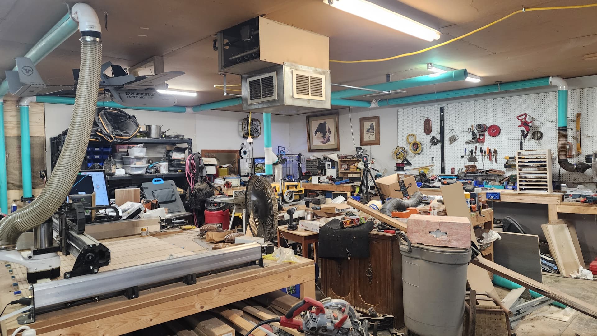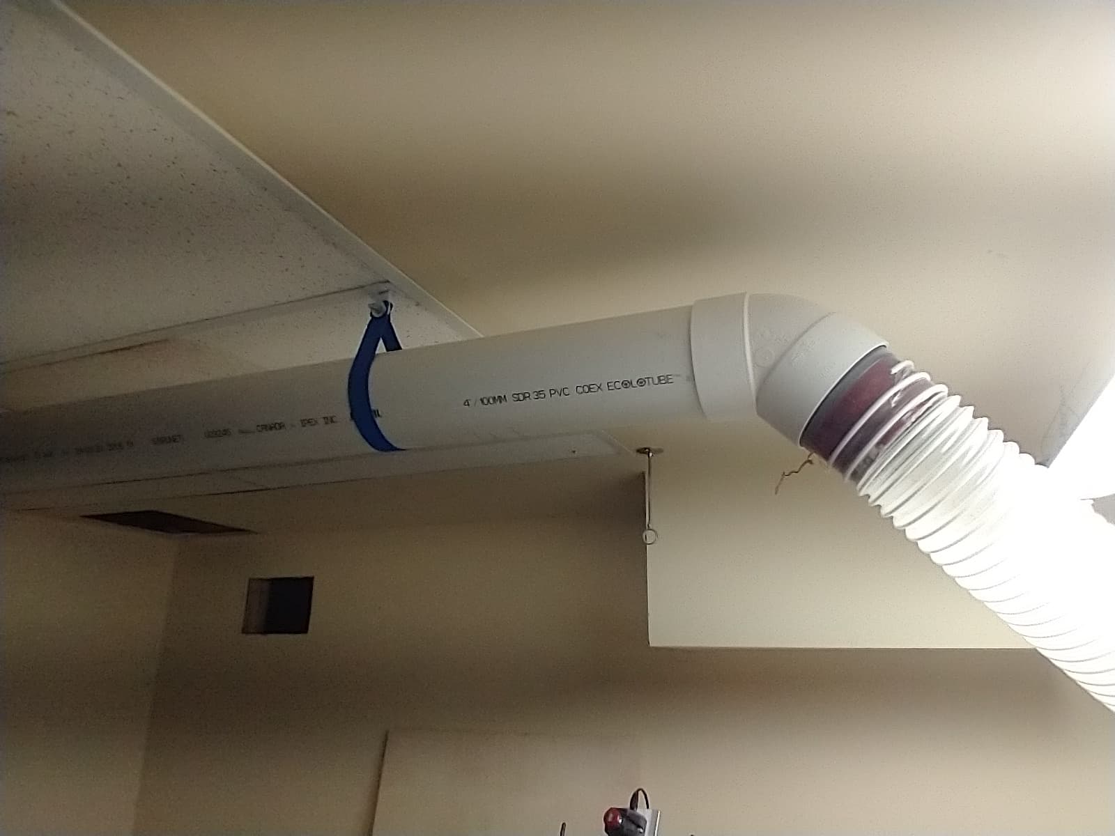 I struggled with several methods of 4" hose placement for my Altmill before coming up with a simple setup that works. Because I have low ceilings, it was difficult to get the hose high enough to clear the spindle as it moved around. I tried bungee cords, pivot arms, and a few other contraptions that didn’t work so well.