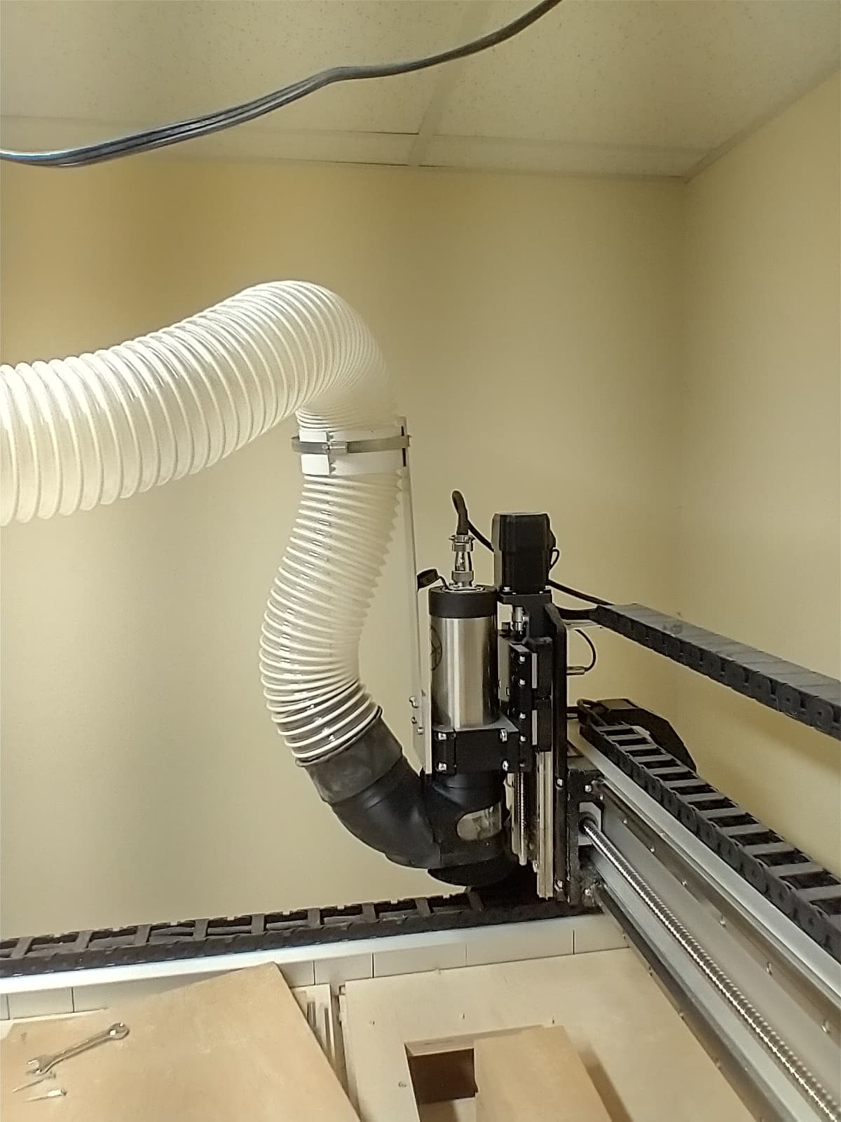 You have it. I wanted the best of both worlds. Fixed position with the spindle, or floating. I had tested a shoe what ran under the gantry and exhausted out the back, but is took too much off the Z usable height.