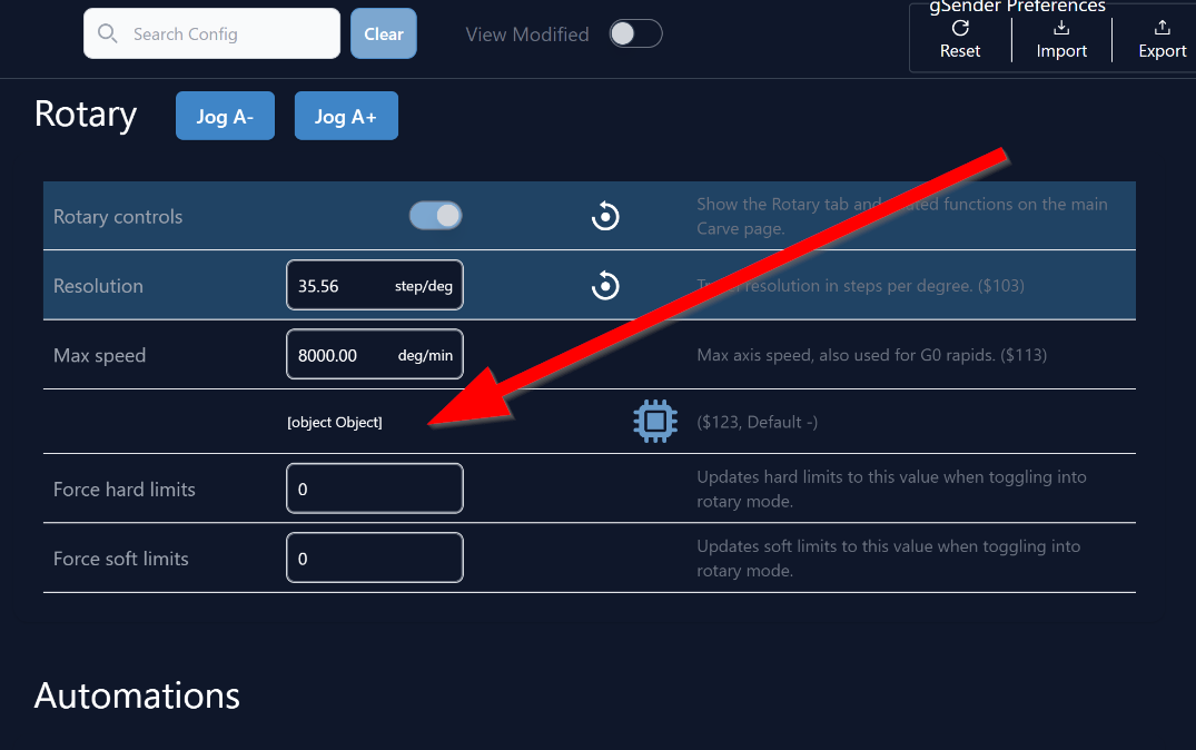When switching back from Rotary mode to normal mode, the Y Axis resolution and rate is reset back to some arbitrary value. I saw another post from a year back saying there were plans for a default value to set it back to ( ) - this is missing from my UI, unsure if this was ever implemented