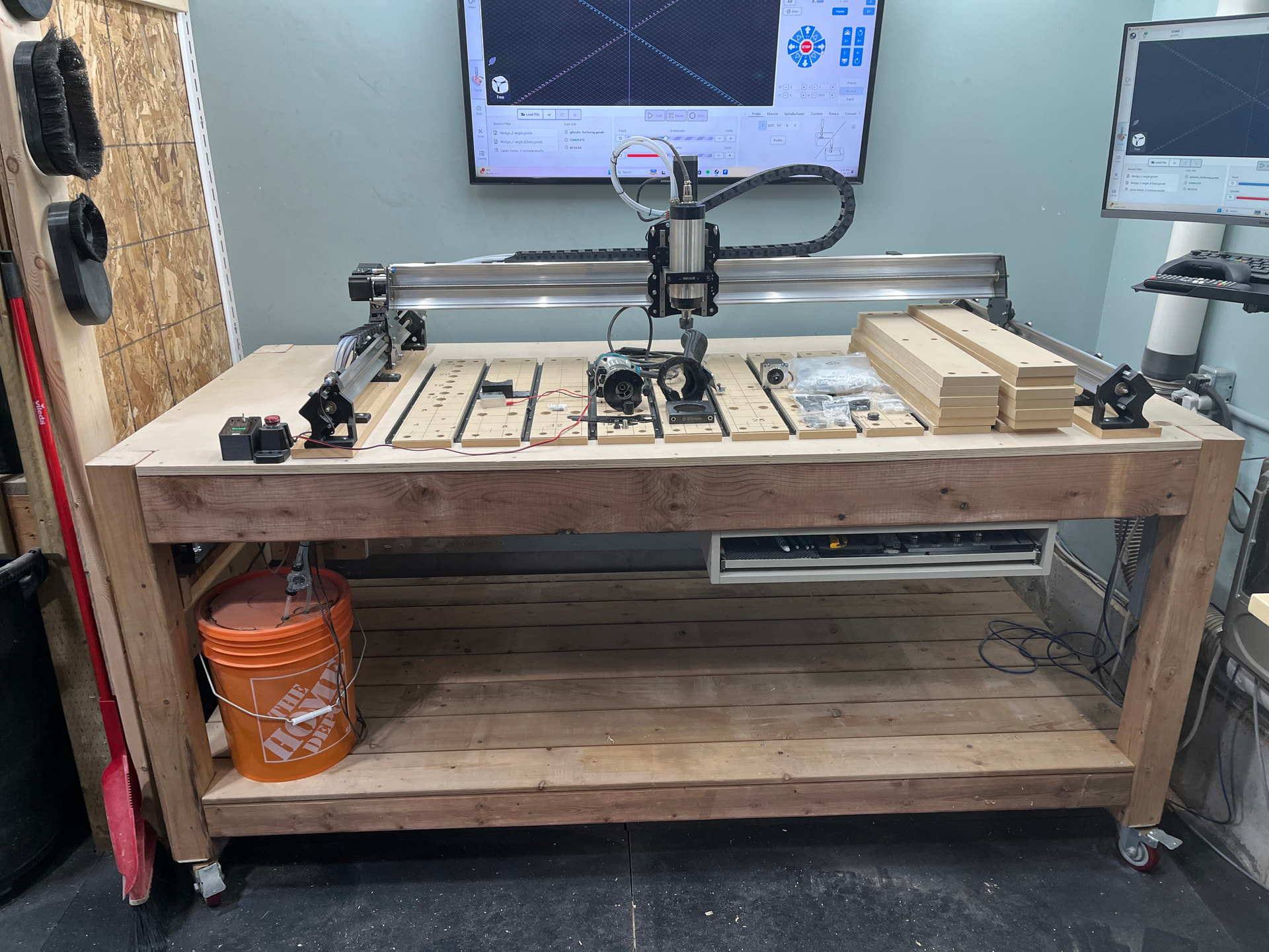 - 84" x 39" work table on 4" locking casters with MDF spoilboard and T-Tracks