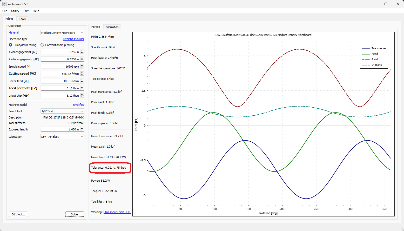As an example hereās what that looks like in millalyzer assuming a 0.50"/12.7mm length of cut, generic geometry, and a normal stickout.