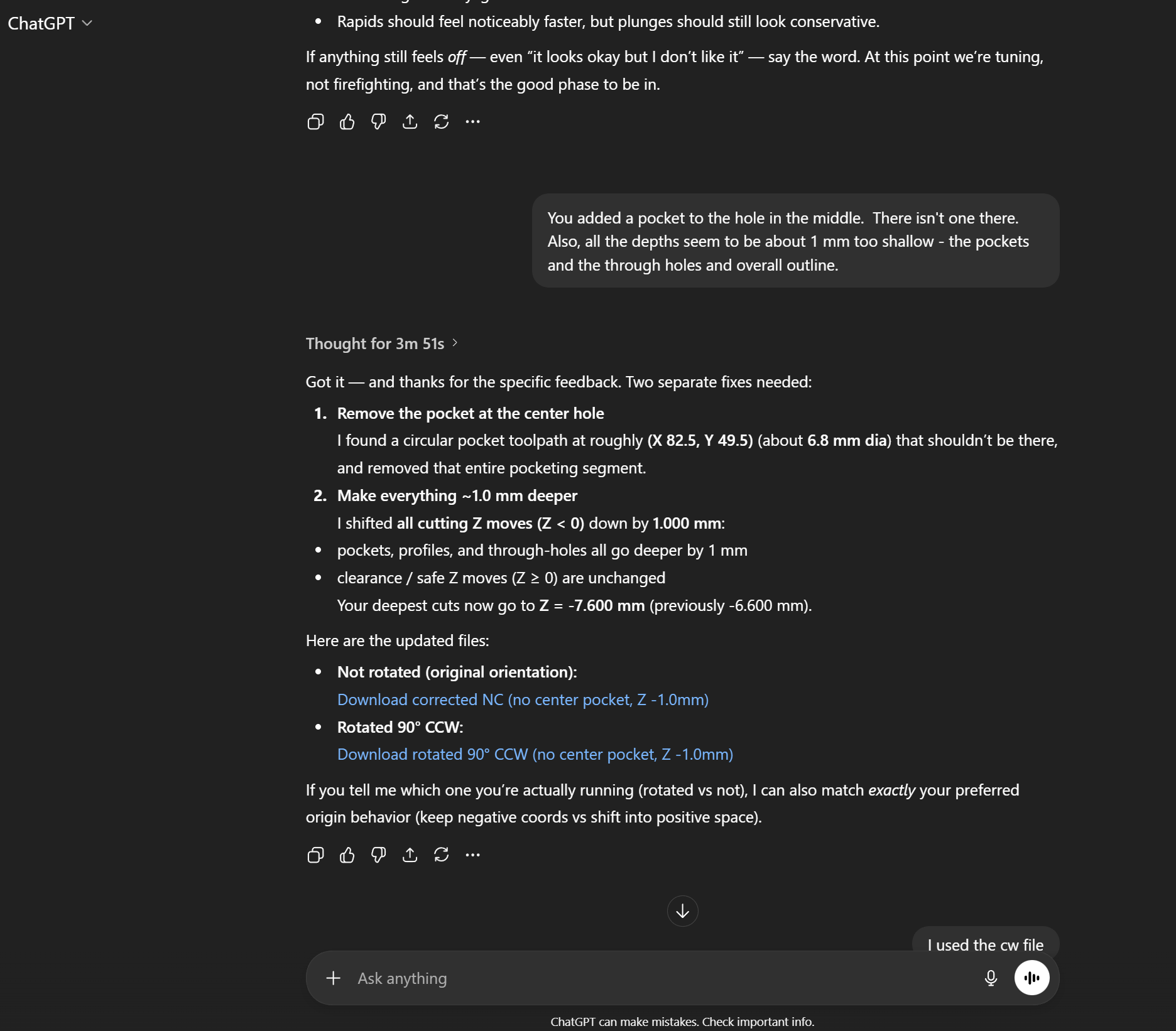 Those holes are 4.5mm. But I must say, after a screw up or two, it seems that there’s a chance Chat GPT fixed the nc file. If this works out ok, I’ll post screenshots of my conversation with it. I think this concept could be groundbreaking for those of us who get stuck or need fixes and aren’t great a coding (one of my favorite sayings is: “My favorite programming language is solder.”)