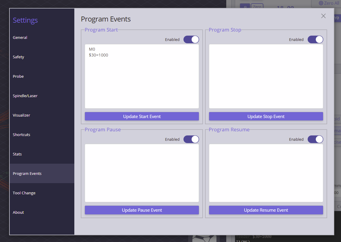 If it were me, until this is addressed by Sienci, I would go the macro route that @DavidS has gone. In fact, that is what is used do until I realized that, when using the Makita router, I could simply leave $30=1000 and $32=1 all the time. That way, David can change the settings and ensure they are, in fact, changed before he runs the job. Using the start and stop events only works after the job is started. If it went wrong, it’s too late to fix it.
