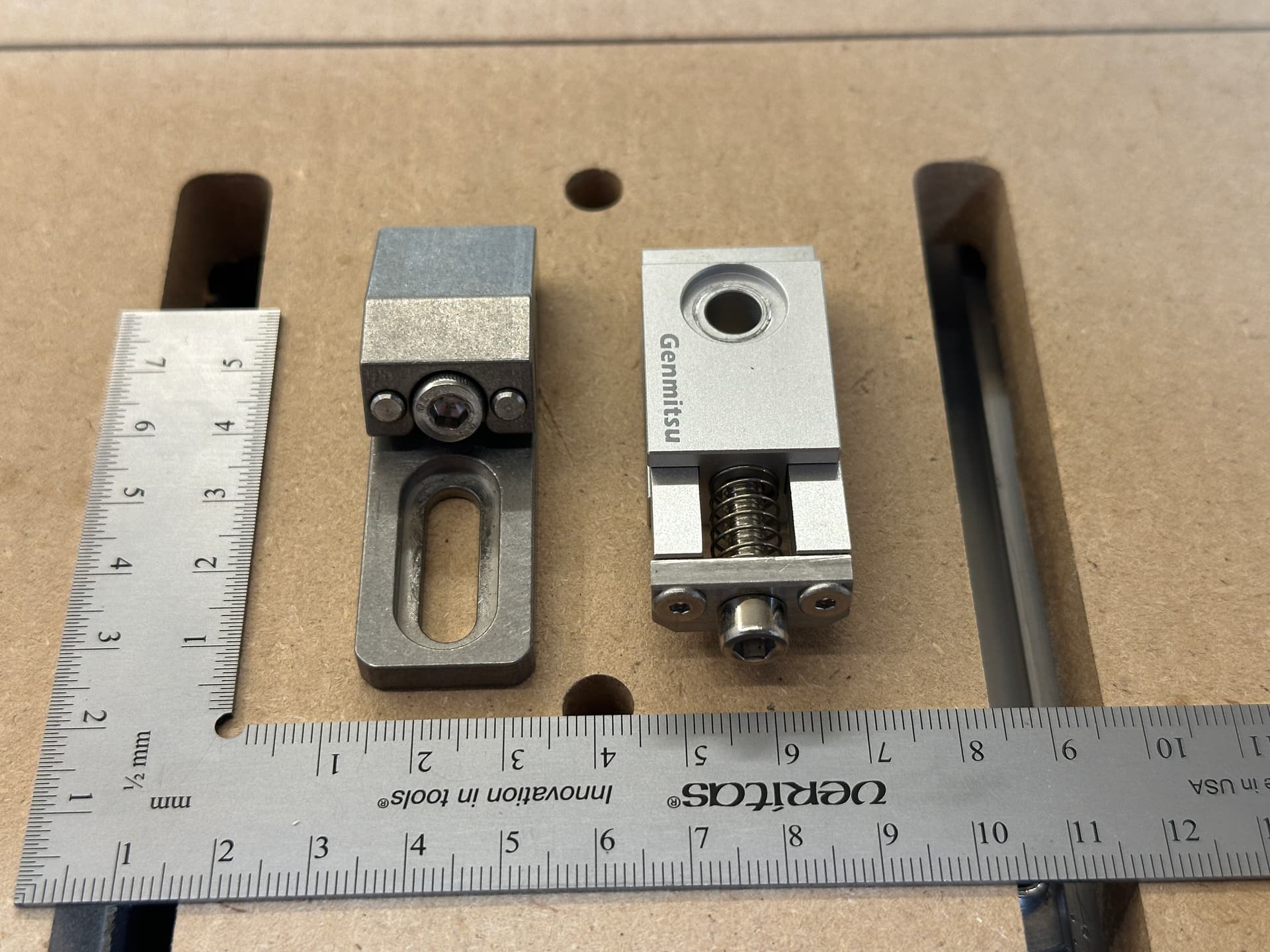 Clearly, I am missing something in this exchange, so I am hoping you guys are help me out. I just looked at the Genmitsu clamps and watched the videos. Correct me if I am wrong, but according to the video, the âwedgeâ piece slides into the track. The clamp piece slides along the top of the track. The bolt âsandwichesâ the track between the wedge and the clamp. The clamp is not threaded. The wedge is. It is serving as a ânutâ in effect.