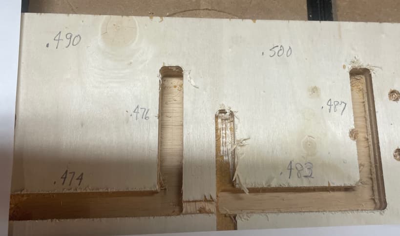 I ran a job where 2 dados in the X and Y directions were 0.49" and 0.50". Unfortunately, the Y cuts were 13 and 14 thousandths of an inch short and the X cuts were 16 and 17 thousandths short.