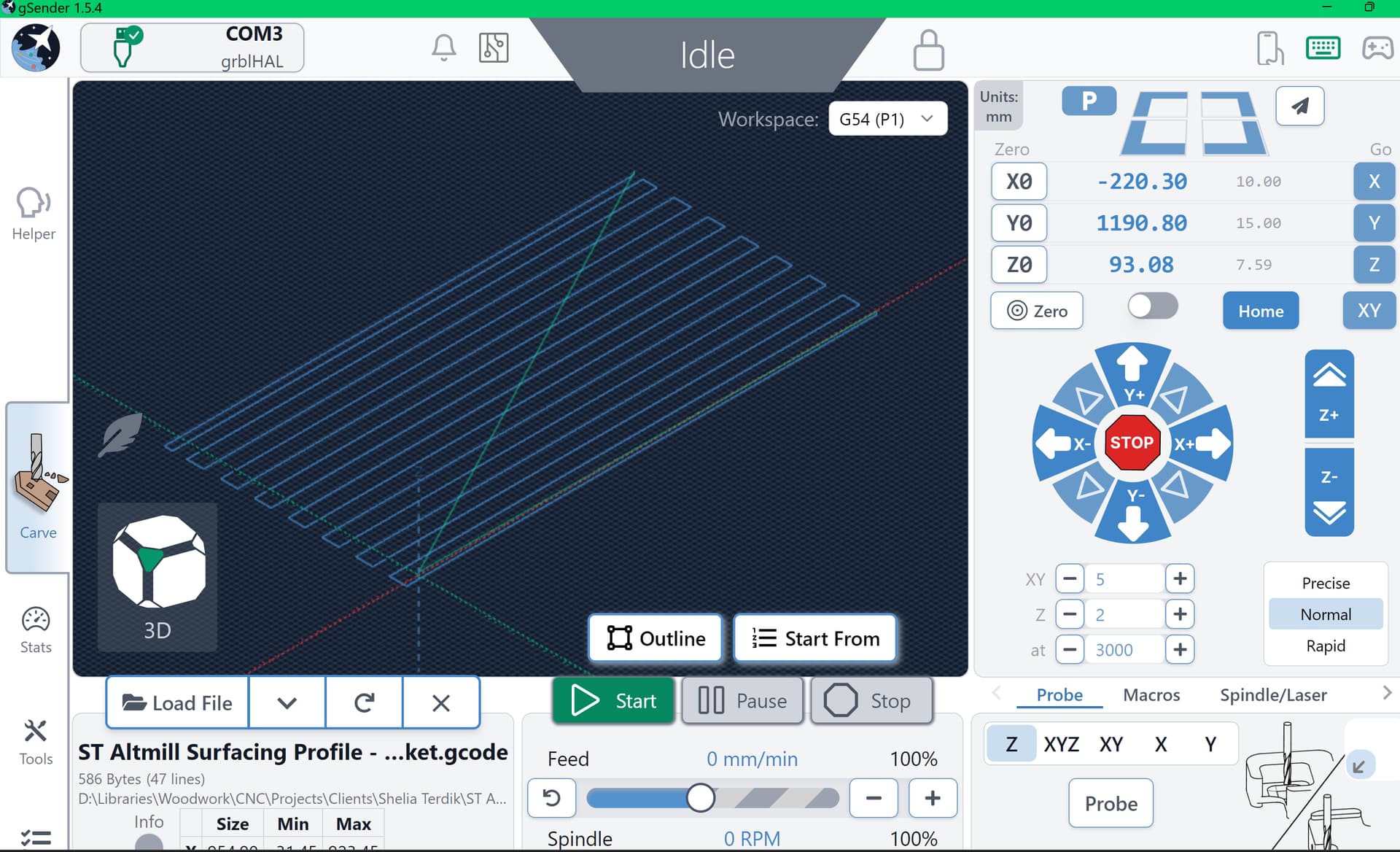 I did discover that when I did get the COM connection error, the spindle continued to cut and finish the entire toolpath. As a workaround, I was able to surface the project board. After each pass is totally completed in gSender, I reconnect to the port, set my new Z value, and start the cut. Within seconds, I’d get the connection error and let it run until the entire surfacing toolpath was finished. Because I was cutting 0.5mm deep with each pass it was necessary to repeat the surfacing about 12 times until the entire surface was completely flat.