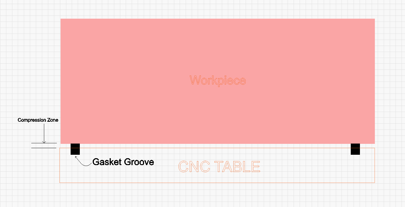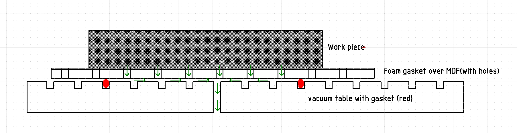 My current iteration of the vacuum table design only has a gasket (red) at the very outside of the table. There is no access to the channel area - there is a 3/4 â board of MDF that is screwed down on top of the area where the air channels are. The overall vacuum hold area is roughly 24*48â.