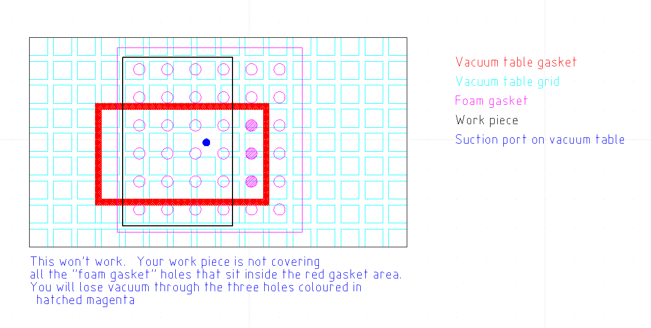 If you add the âfoam gasketâ (which is just a 1/16" piece of foam rubber glued to 1/4" hardboard or similar, with a bunch of 1/4" holes), you just need to make sure your work piece covers all the 1/4" holes that sit inside the red gasket area.