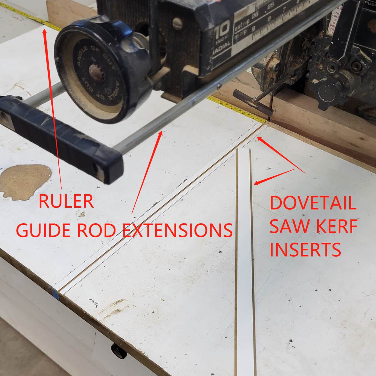 I also added an 1/8” layer of white hardboard to the surface. I made dovetailed strips, of the same material, which slide into the adjacent 1/8” material. These sacrificial strips can be slid out and replaced so there is always a precise saw kerf which shows where the cut is made. I have a cut piece of aluminum angle-iron, hose-clamped to the column. This allows me to raise the blade for shallow cuts and then drop the blade until it hits that “hard stop” and not cut into the 1/8” strip more than 1/16” .