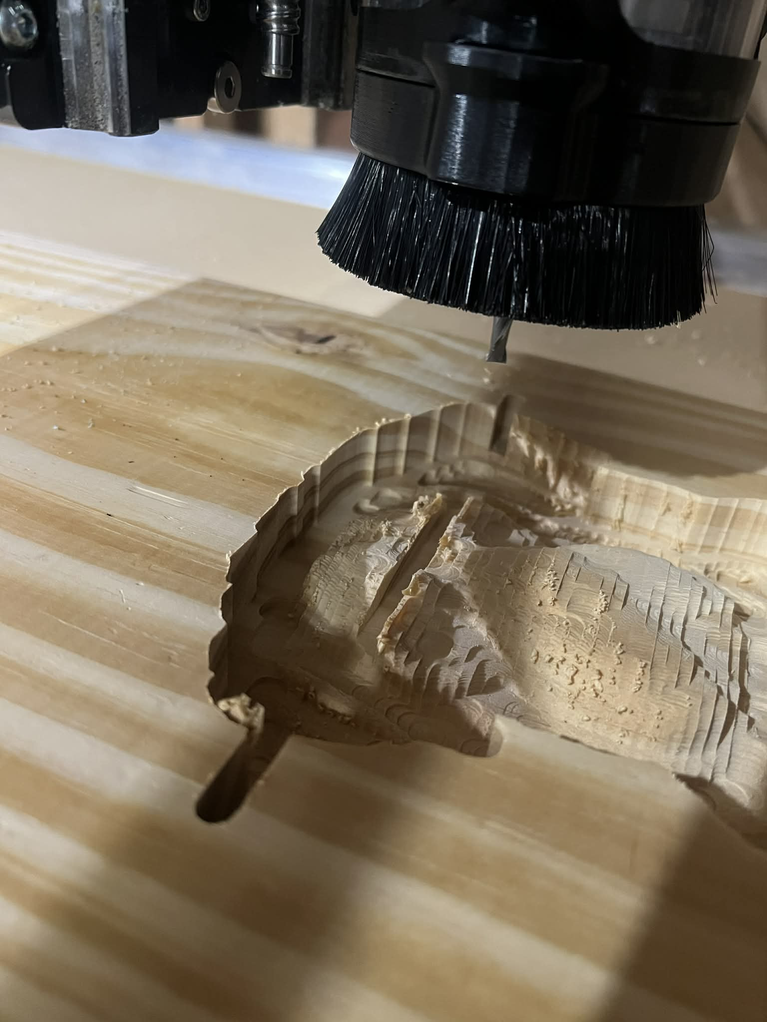 This happens during the roughing pass on 1.51in Pine using the 1.5Kw with a Spindle 1/4″ Flat Upcut 2Flute (edit) We’re using a AltMill 4x4
